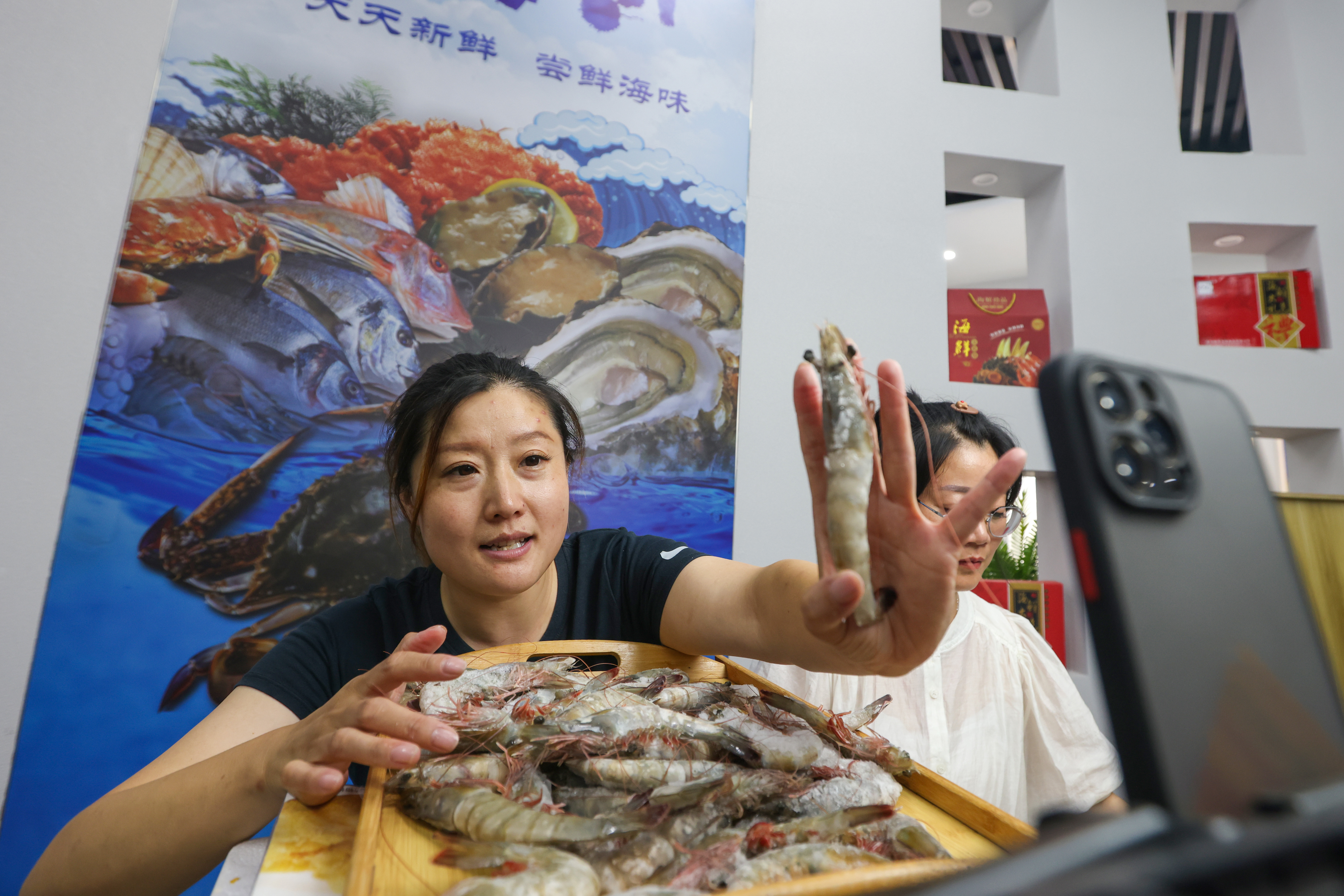 “快到618啦,今天在咱们直播间,点点关注,4斤海洋大虾99块钱到手……拼手速、拼网速啦!”6月14日,一走进连云港市赣榆区石桥镇九里海产品电商创业园,热闹的直播带货声就传入耳畔。九里姑娘李宁正在向网友们推介特色海产品,一分钟内,海洋大虾就被抢购一空。