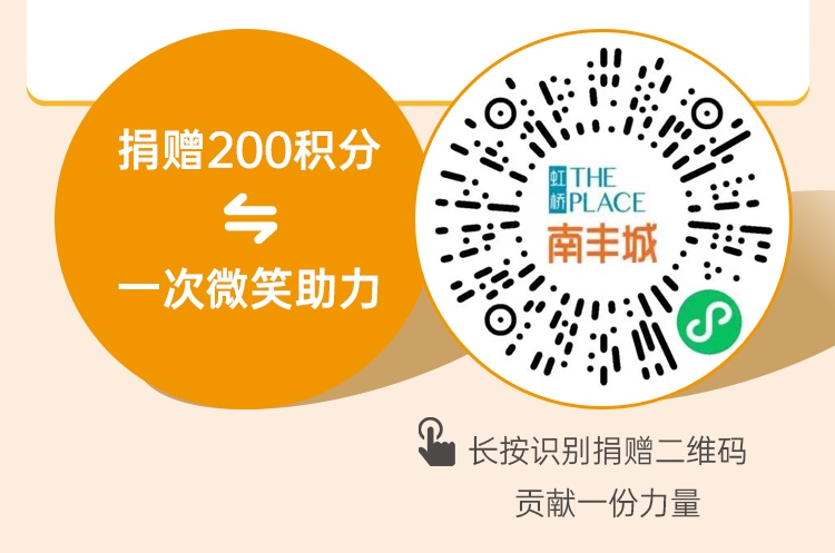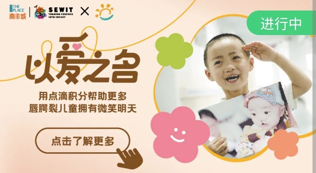 2023年,虹桥南丰城依托“南丰少年儿童慈善基金”,再次开启“以爱之名”微笑助力行动,商场会员可通过积分捐赠兑换善款的方式,助力唇腭裂宝宝公益修复手术,献上力所能及的一份关爱。微笑助力行动捐赠通道已开启,识别下方二维码即可参与。