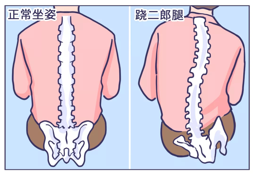 人在跷起二郎腿时,容易弯腰驼背,造成腰椎、胸椎和脊椎的压力分布不均。而此时的骨盆会带动脊椎旋转,造成肌肉拉伸,导致脊椎左右两边的软组织被动失去平衡,久而久之,容易带来背部肌肉疲劳、酸痛,甚至可能造成脊椎扭曲或侧弯。