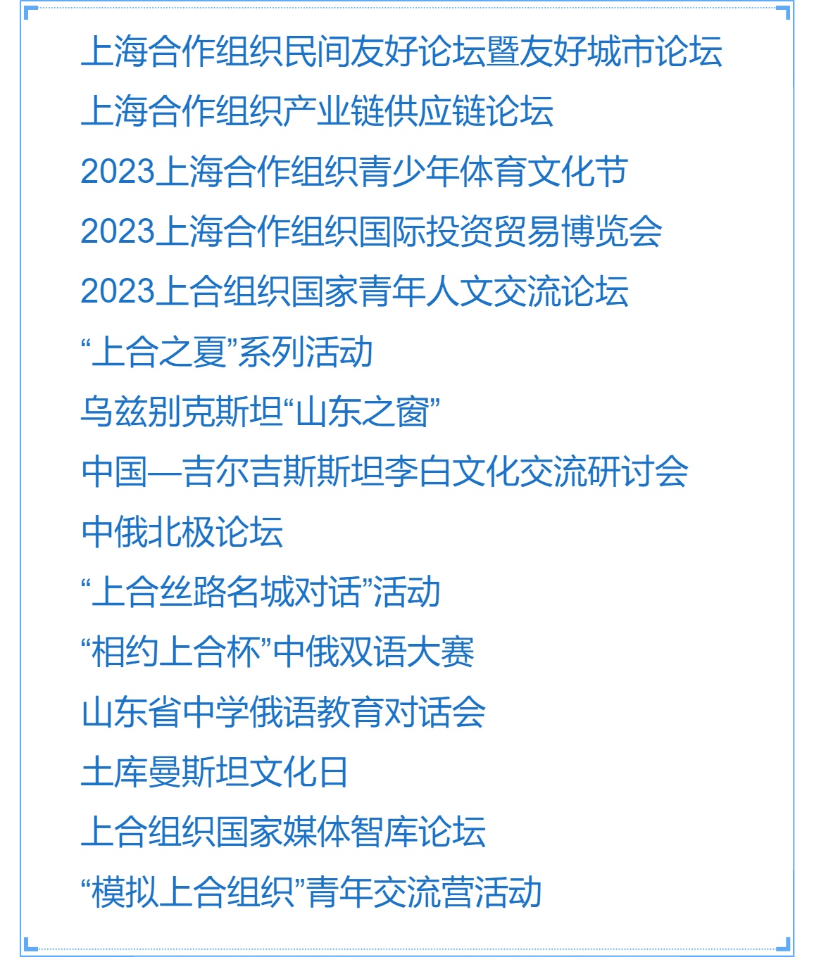 论坛现场举行了“中国(山东)—上海合作组织国家友好合作交流季”启动仪式,15场重点活动对外发布。包括: