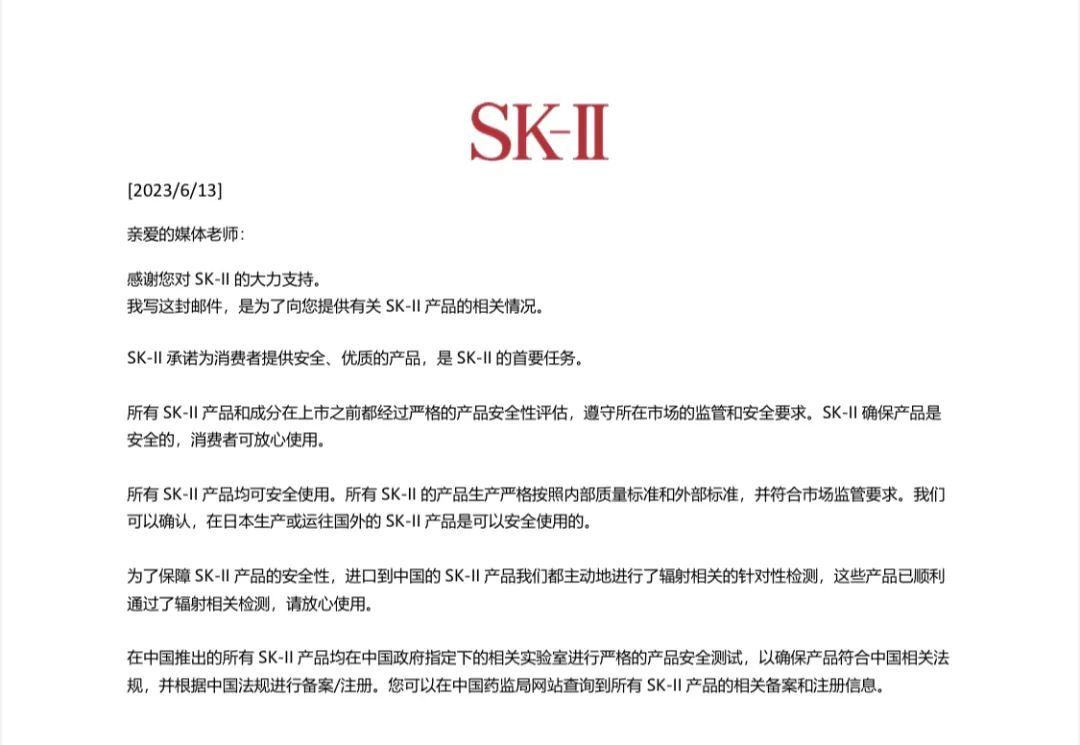 SK-II同时表示,旗下所有产品和成分上市之前均经过安全性评估,遵守所在市场的监管和安全要求。SK-II进口到中国的产品都已进行并通过辐射相关的针对性检测,可在中国药监局网站查询到相关备案信息。