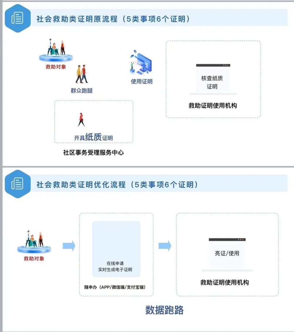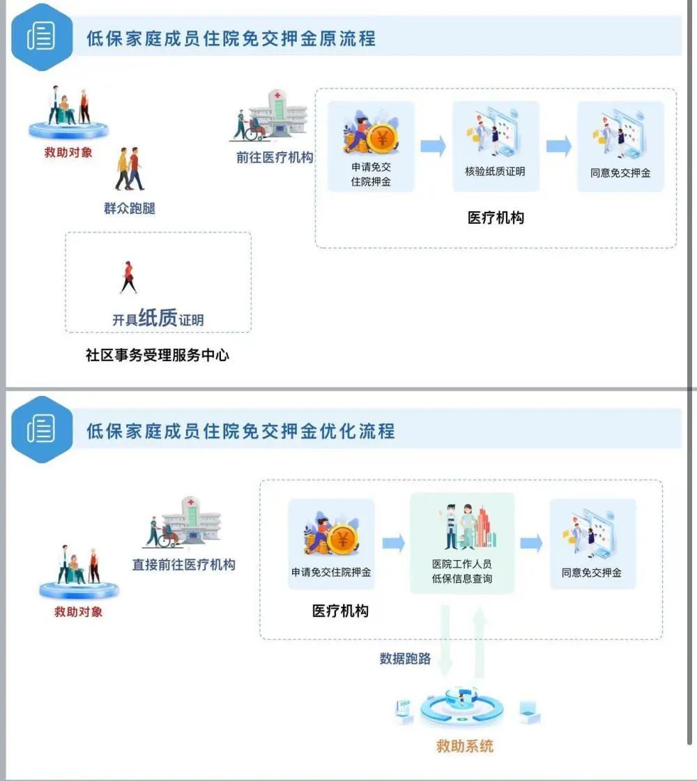 本市低保人员以往到医院办理住院押金减免手续时,须提供户籍所属街镇社区事务受理中心开具的低保人员证明。但开证明在实际操作中却有诸多不便:人户分离的办理者不得不为了办理证明来回奔波;腿脚不便或上了年纪的独居孤寡办理者,到社区事务受理中心办事耗时耗力。