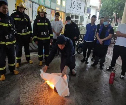 “我们的消防员刚刚展示了油锅起火后怎样用灭火毯灭火,有哪位要来试一试吗?”“我来!”随着一声响亮的回答,一位消防志愿队队员勇敢地站到了起火的燃烧桶旁。只见他按照之前消防员讲解的灭火毯使用要点,动作略显生疏地将灭火毯从火苗上风处向火源裹去,过了一会儿,火焰逐渐熄灭。通过实操培训,有效提升了消防志愿队队员的应急处置能力,确保消防志愿队在扑灭初期火灾时能够拉得出、冲得上、打得赢。