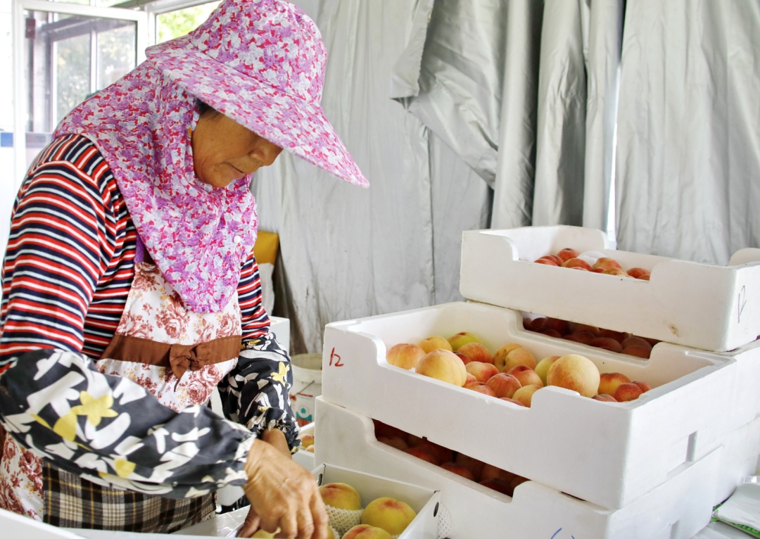 来到廊下镇天母果园,桃林里丝竹之声悦耳,古琴声悠扬。桃树上,一颗颗成熟的水蜜桃挂满枝头。水蜜桃白里透红,个头饱满,现场桃农仔细地将它们采摘下来,打包装箱。