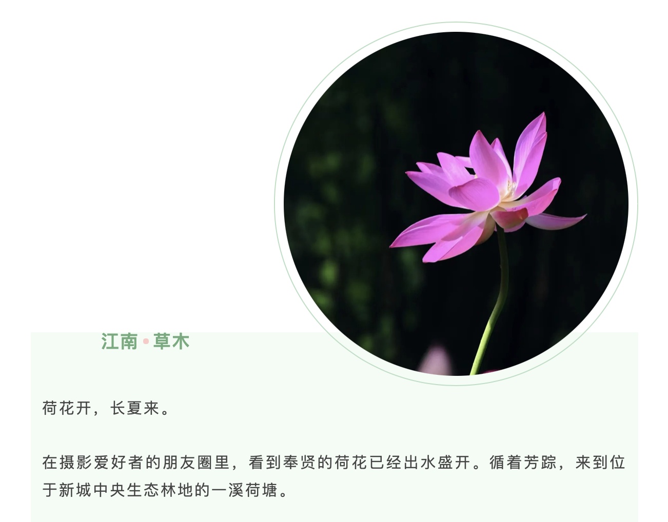 “江南可采莲,莲叶何田田。”荷花,自古与江南“藕丝相连”。在奉贤这片新江南之地,荷花,于古华园外的小桥流水中,守着一方园林的古典;在中央生态林地的浓荫下,独寻一份清幽;在海湾生态公园中,演绎着古人采莲时“乱入池中看不见,闻歌始觉有人来”的意境;在奉贤各郊野河边,亭亭玉立……