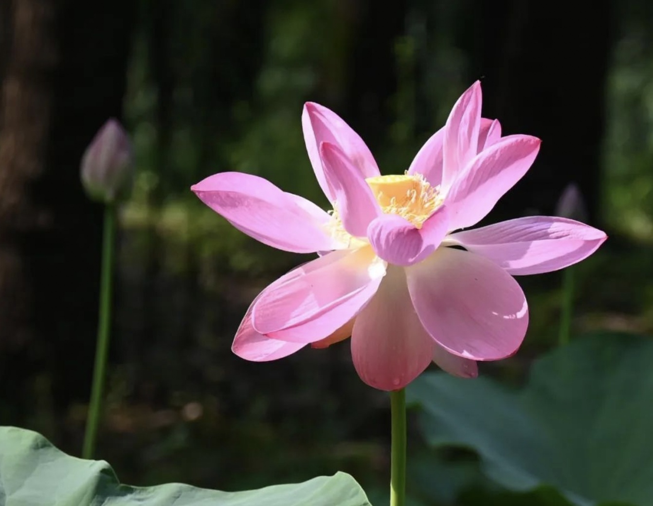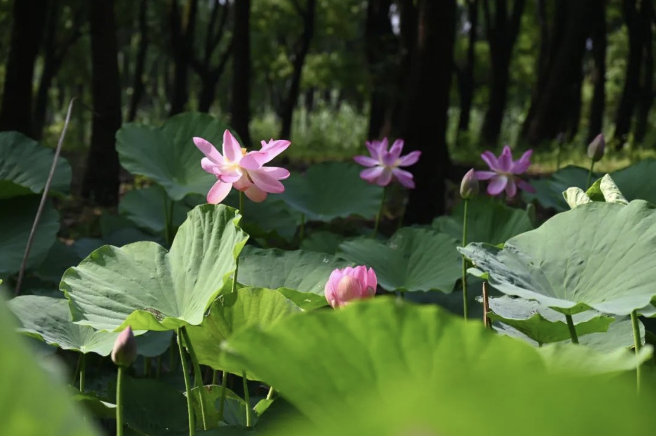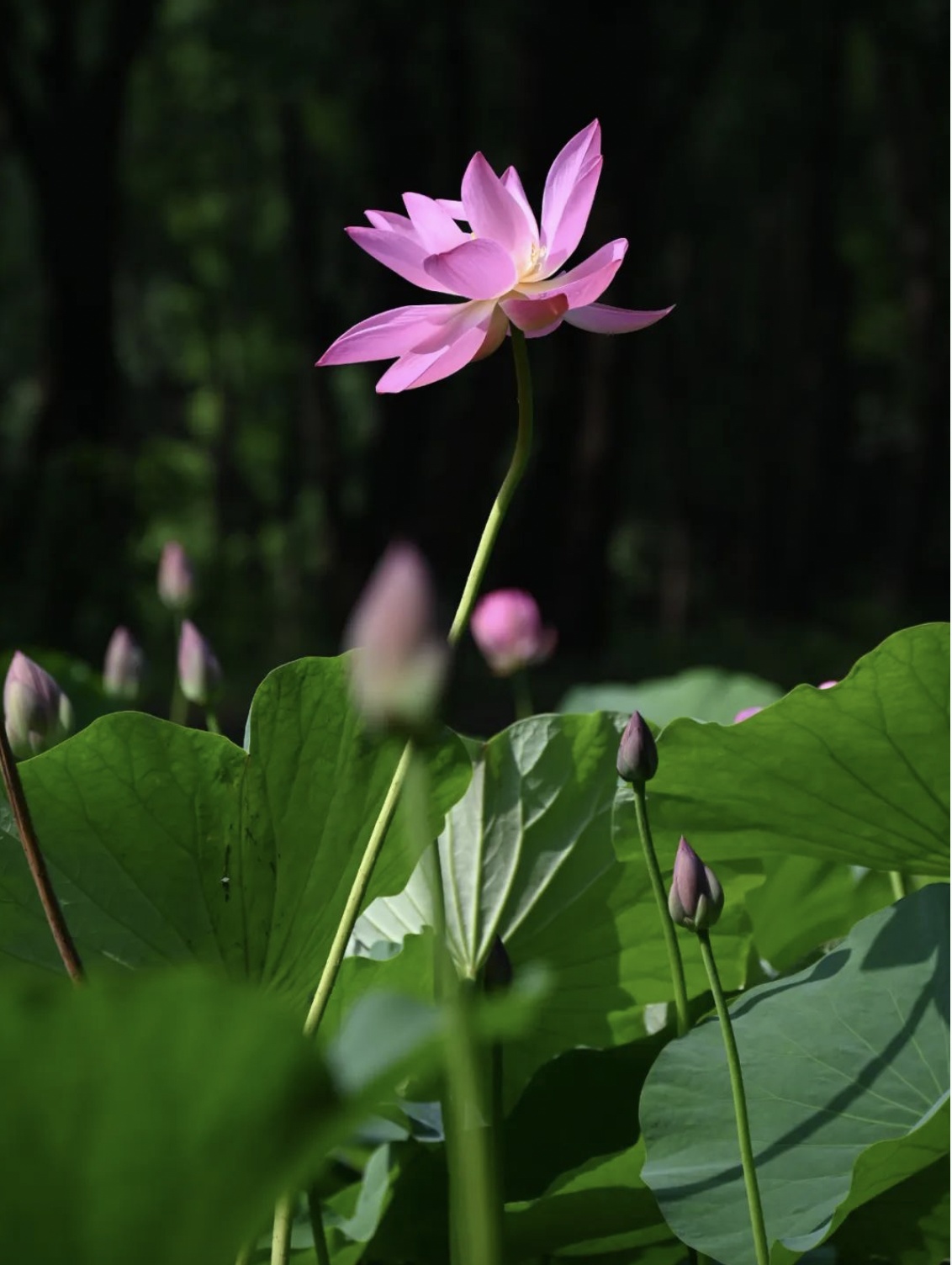 昨晚暴雨袭城,清晨的荷花不免让人想到“夏、雨、荷”的妙处,林地间初夏雨后的荷花,正是宋人笔下的“叶上初阳干宿雨,水面清圆,一一风荷举。”