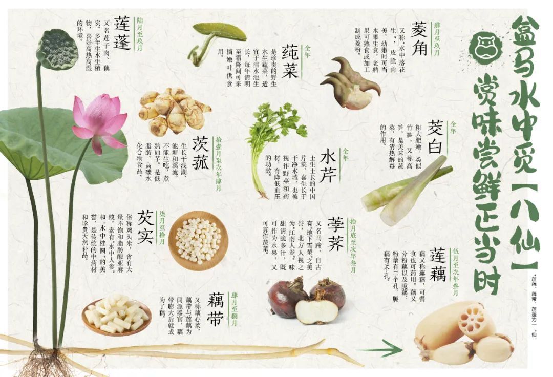 “水八仙”是江南时鲜蔬菜的地方特色代表,又称“水八鲜”,指菱角、荸荠、鸡头米、水芹菜、茨菰、茭白、莲藕和莼菜8种水生植物。它们各有时令,从夏到秋陆续成熟,正所谓“春有荸荠夏时藕,秋末茨菇冬芹菜,三到十月茭白鲜,水生四季有蔬菜。”