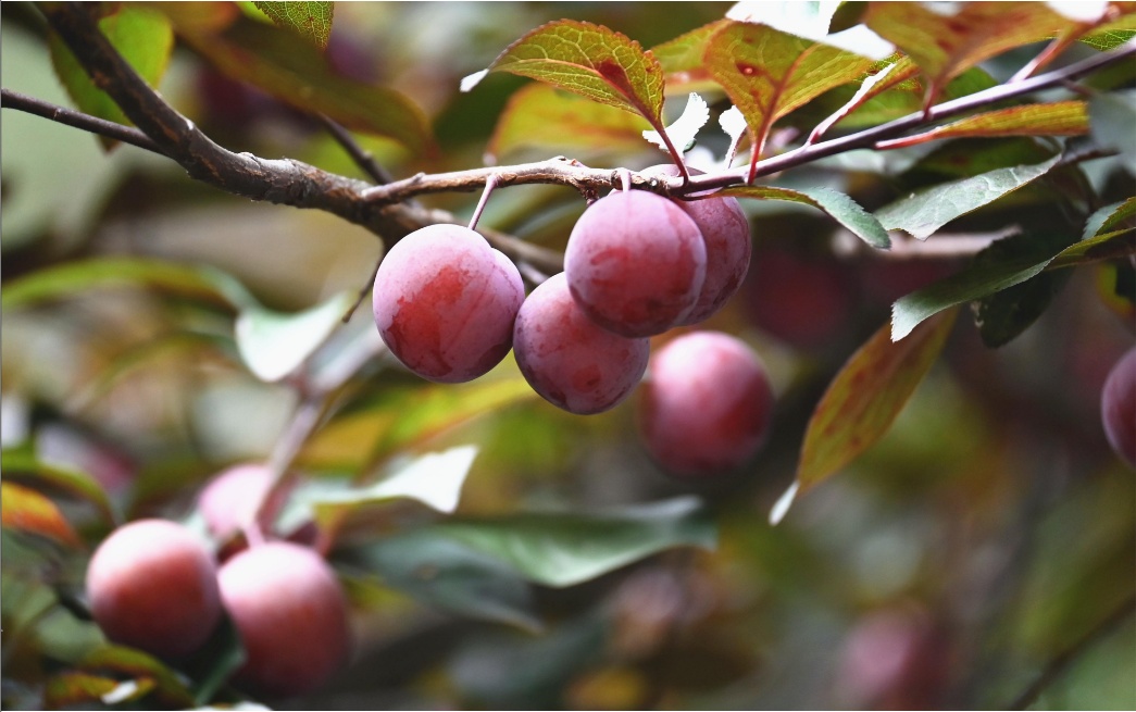 春季爆花的紫叶李在夏季也结出累累硕果,一颗颗紫红色果实压弯了枝条。作为园艺观赏品种,其果子酸涩,不建议采摘食用。