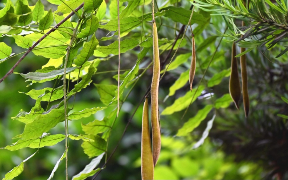 下垂似豆荚的是紫藤的果实,一条条挂满藤架。成熟后会像崩豆一样噼里啪啦炸裂开来,种子随后散落,有的甚至能跑出好远。