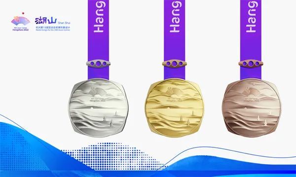 杭州亚运会奖牌取名为“湖山”,它的设计灵感源自五千年良渚文明,展示中国江南文化,呈现杭州山水景观。在亚运会奖牌设计中首次将方形玉琮和圆形奖章融为一体,其中奖牌正面用凸出的线条勾勒出“三面云山一面城”的杭城画卷,湖水涟漪,山峦起伏,美不胜收;奖牌背面,形似方形印章,寓意运动员们在杭州亚运会上留下美好的印记。整体设计别具一格,具有很高的辨识度,体现了美美与共、和而不同的含义。