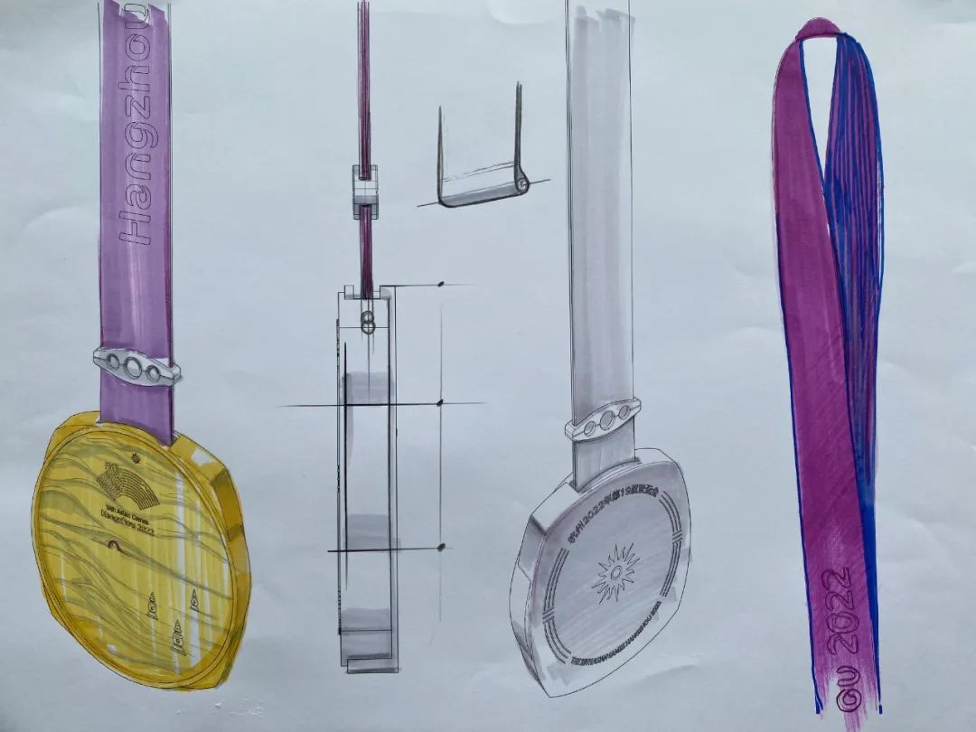 担任奖牌设计团队主要负责人的中国美术学院工业设计系主任章俊杰表示:“奖牌设计意象汇聚了杭州三大世界文化遗产:西湖、大运河、良渚古城遗址,打破了亚运会标志放在奖牌中心的常规版式,将标志置于开阔的画卷之上,体现开放包容的东方审美。”