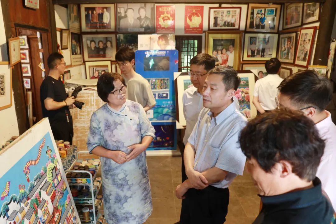 6月15日下午,诸迪一行专程前往上海金山中国农民画村调研指导,听取金山区文联工作汇报和中国农民画村运营工作报告,走访了部分农民画画家工作室,实地了解了金山农民画的创作情况、传承情况及农民画村的经营情况,并与金山区相关部门领导及金山农民画画家代表进行座谈。诸迪充分肯定了金山农民画画家们的创作,认为他们的作品很鲜活、接地气,具有浓郁的乡土气息。他指出,要进一步深入开展调研,倾听农民画画家、从业者的心声,为他们解难题、办实事,爱护好、传承好、发展好金山农民画,让更多的人参与农民画创作,使农民精神生活更加充盈,推动乡村文化振兴,进一步擦亮金山农民画品牌。下一步要通过文艺志愿服务结对子的方式,在金山农民画的人才培养、创作提升、文创产品开发、市场推广等方面进一步发挥组织优势,不断扩大金山农民画的传播力和影响力。