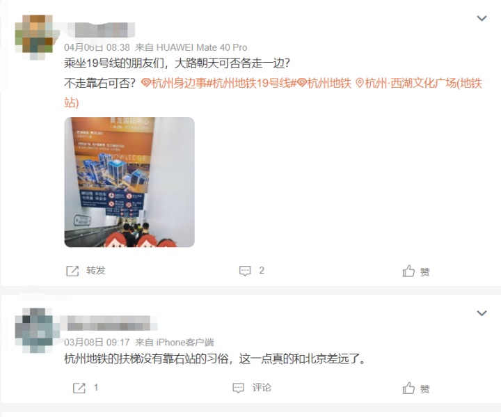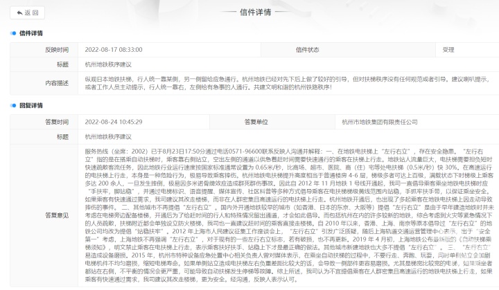 有这样想法的人还不少,在杭州民呼我为平台上,也有市民提出:“纵观日本地铁扶梯,行人统一靠某侧,另一侧留给应急通行。杭州地铁已经对先下后上做了较好引导,但对扶梯秩序没有任何规范或者引导。建议喇叭提示,或者工作人员主动提示,行人统一靠右,左侧给有急事的人通行。”