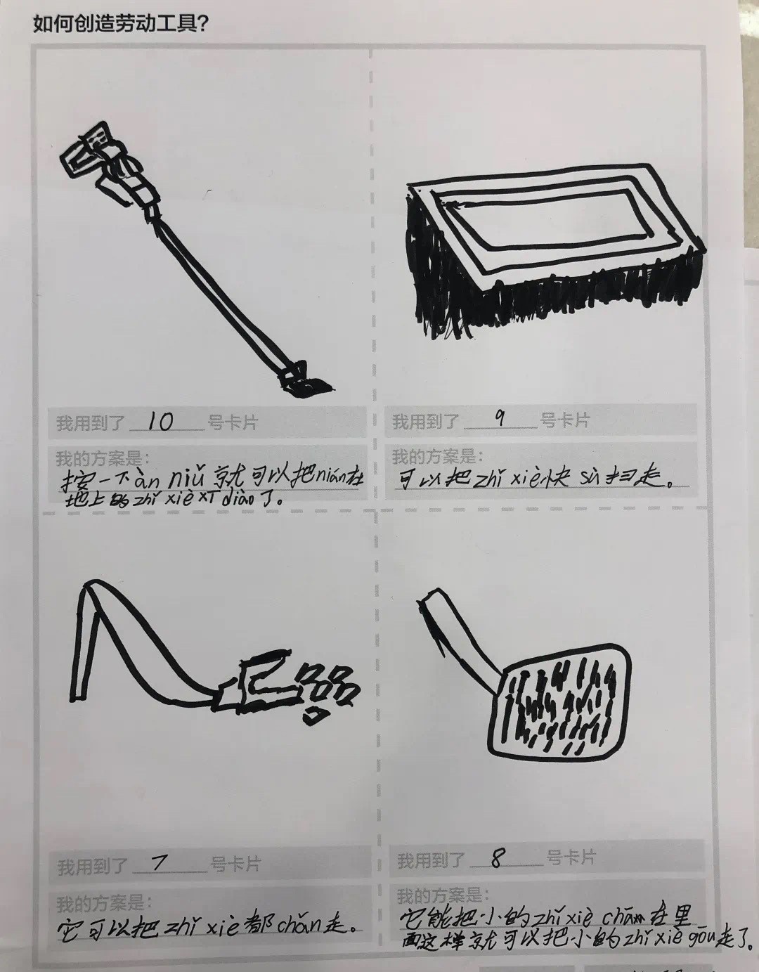 在体验过清扫楼梯的过程和清洁工人工作的辛苦后,孩子们开始了各自的研究。如何设计打扫楼梯的动线呢?他们根据楼梯的特点和结构画出了不同的打扫的路线。最后,针对发现的打扫问题,学生们运用技术卡片设计解决的方案,画出改进方式的草图,制作模型并反复调整修正。