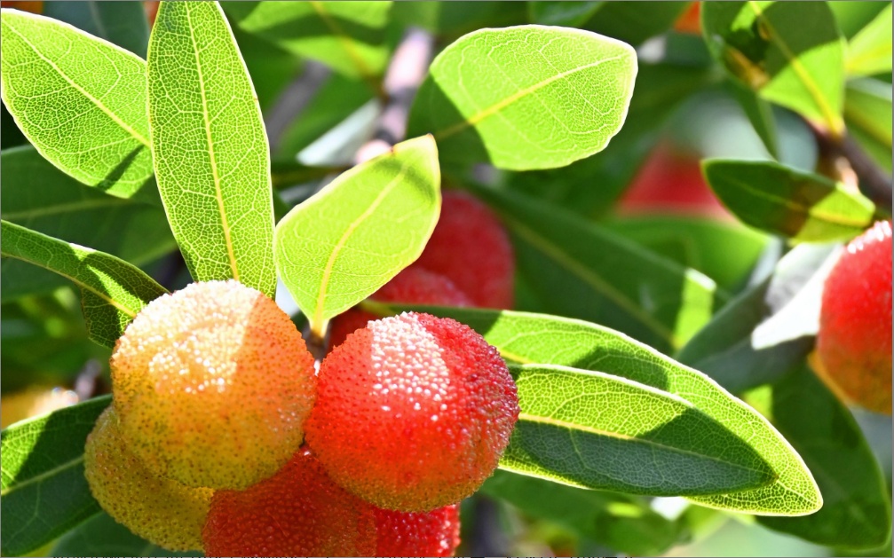 红彤彤的是杨梅的果实,一颗颗圆润饱满。杨梅是梅雨季里最令人期待的,望梅而生津,也解了一丝暑气。