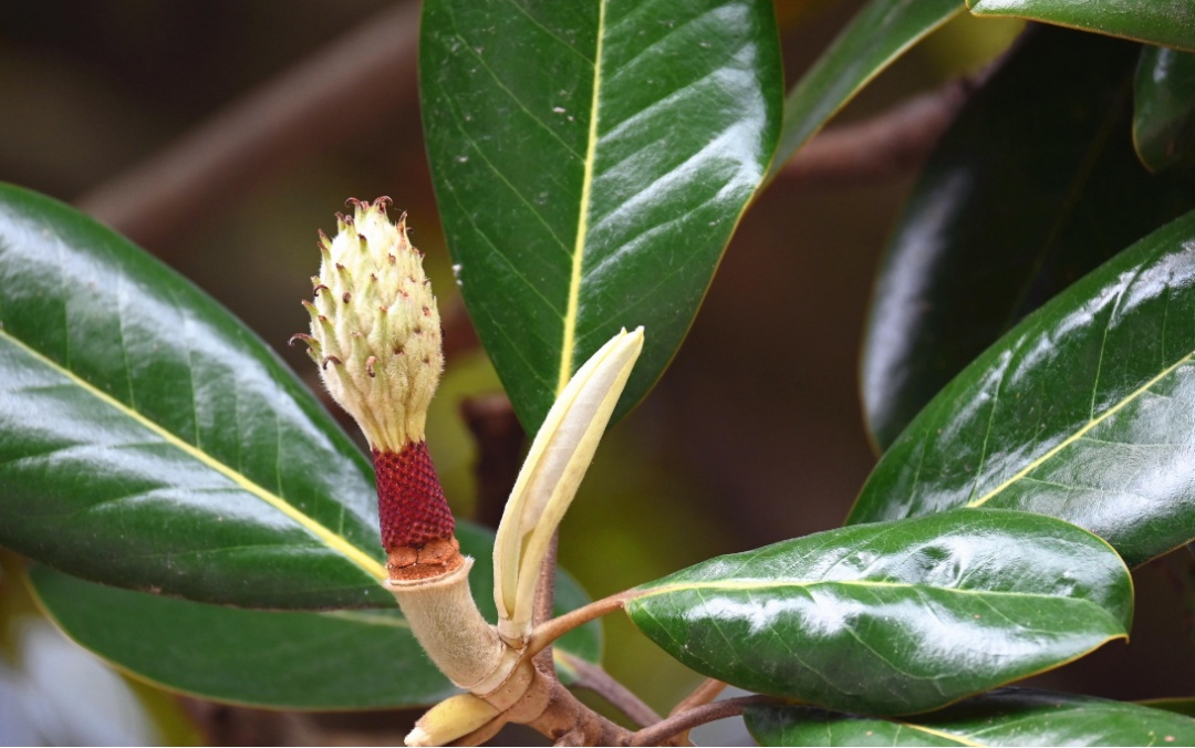 广玉兰的果实似小火炬般立于枝头。待到成熟时,一粒粒鲜艳红亮的种子会从外壳里钻出,颇具观赏价值。