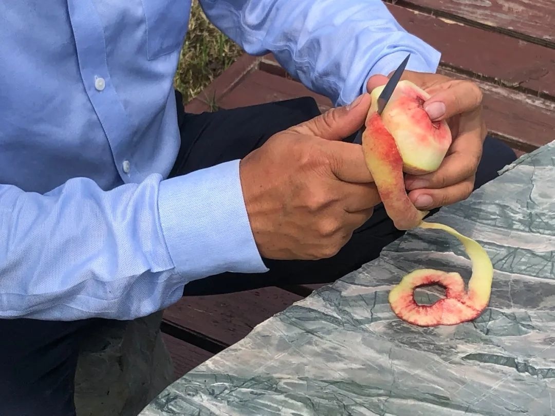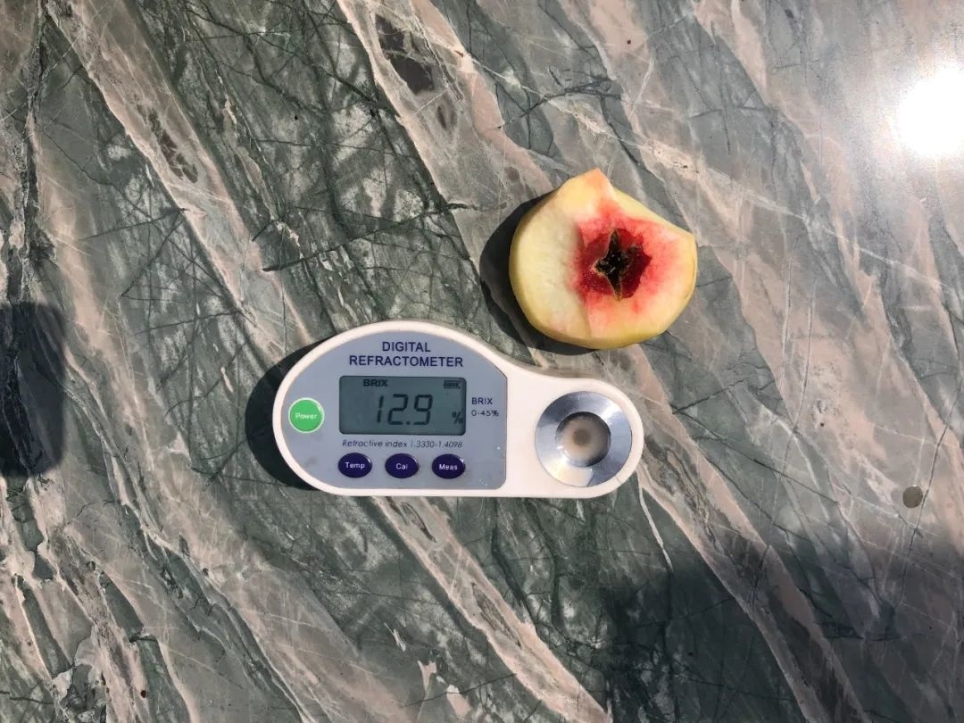 由于今年瑞潘13号膨大期多雨,果实个头好于去年。现场,工作人员现采了一个蟠桃测糖度,虽是刚成熟,而糖度已达近13度。