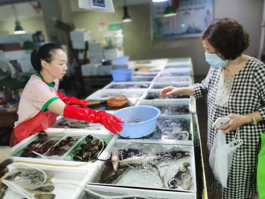 早上8点30分,长宁的美天太阳菜市场里人流熙攘,不少市民已选购好了蔬菜,提着大包小包来到水产区域挑选鱼虾。