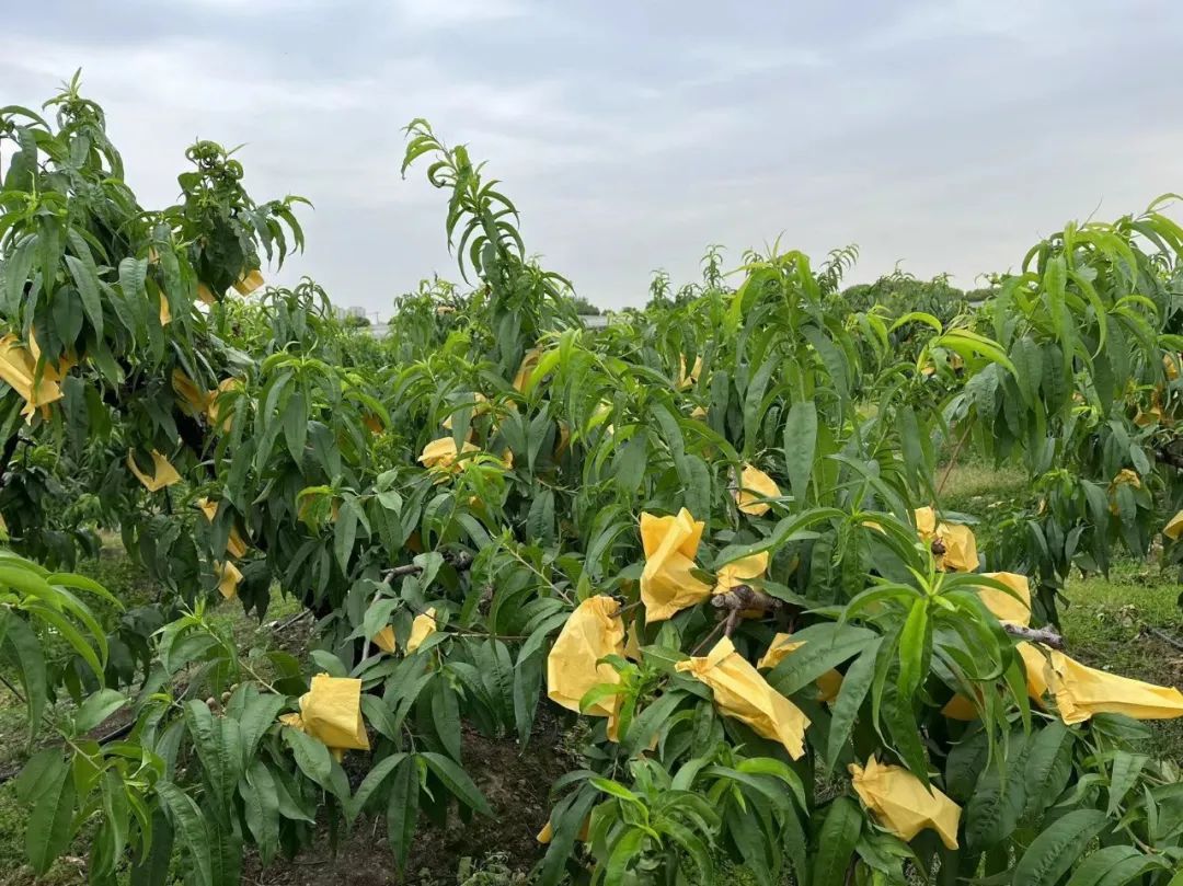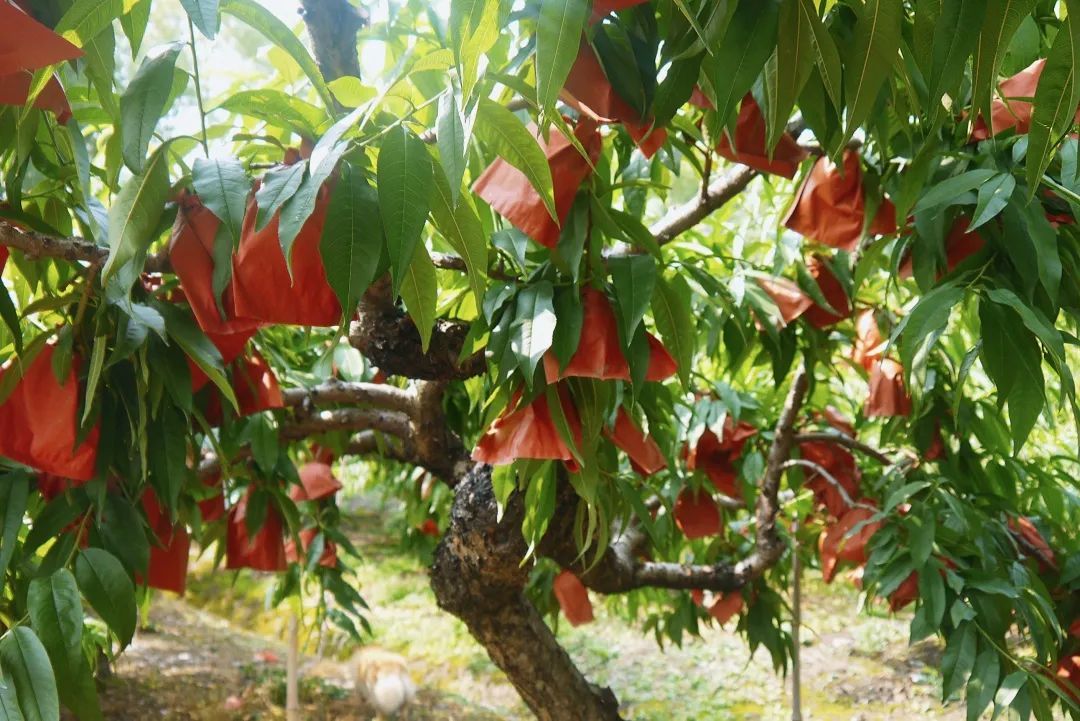 走进位于外冈镇巨门村的锦绣桃园,绿油油的桃树上,裹着牛皮纸“外衣”的桃子挂满枝头,香气四溢。
