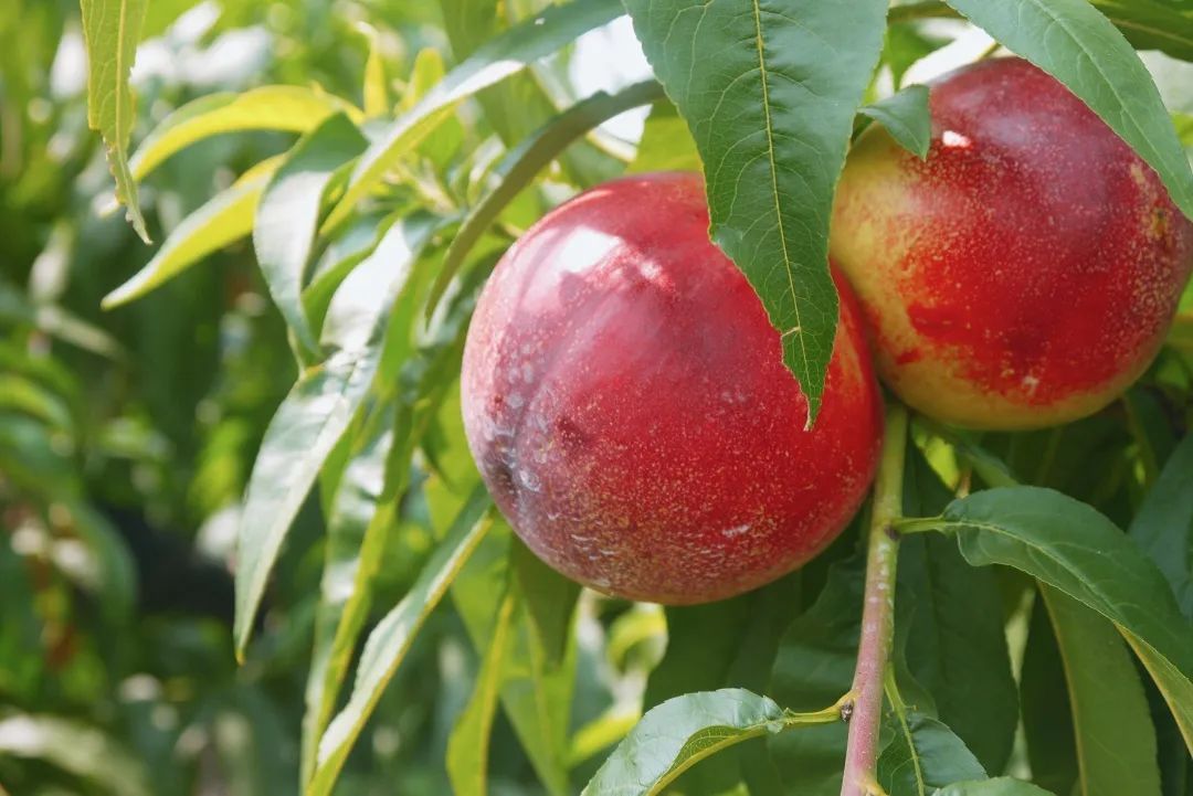 眼下也是油桃成熟期,果园另一边的油桃树上,色泽鲜亮的油桃挂满枝头。刚从果树上摘下的油桃甜脆爽口,“咔滋咔滋”吃起来十分过瘾。