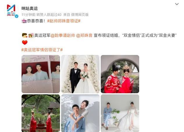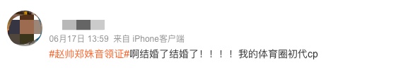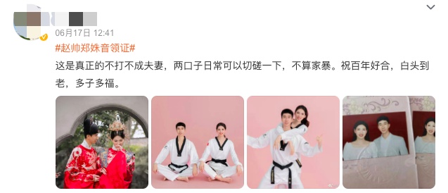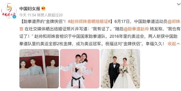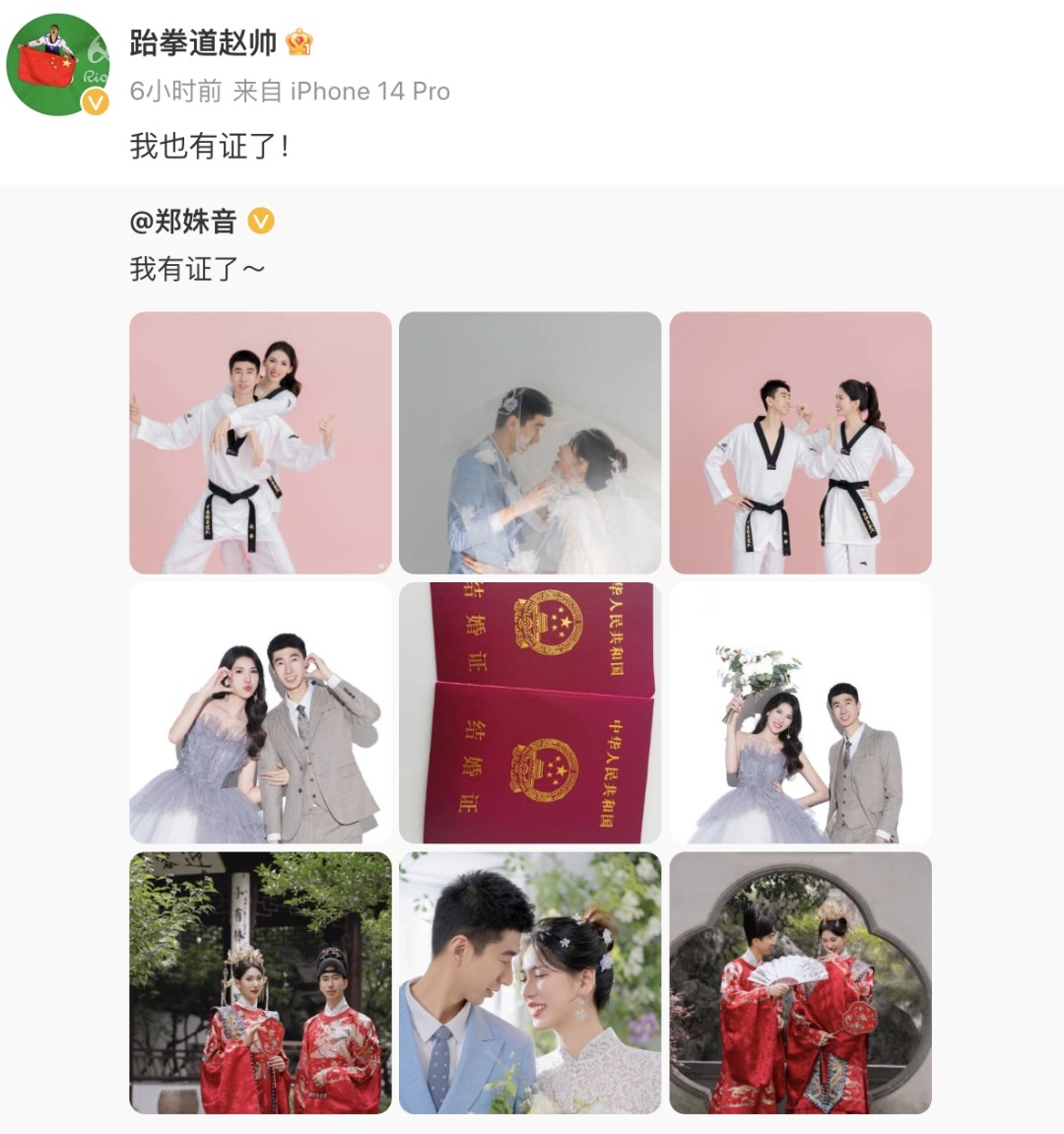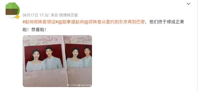 6月17日,中国跆拳道运动员郑姝音在社交媒体晒出结婚证照片并写道:“我有证了~”随后赵帅转发这条社交媒体,“我也有证了!”