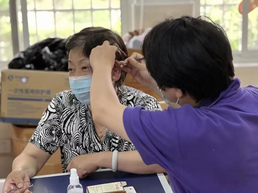 理工二居民区是一个老年人居多的老旧小区,失眠以及长期失眠引起的记忆力下降等问题已经成为社区老人的共性问题。老人长期失眠,会降低免疫力,导致健忘、记忆力下降,并且增加罹患老年认知症的风险。启动仪式之后,来自中医药大学的缪医生为现场所有居民逐一进行了贴耳穴服务,并向居民们传授日常按摩手法和注意事项。
