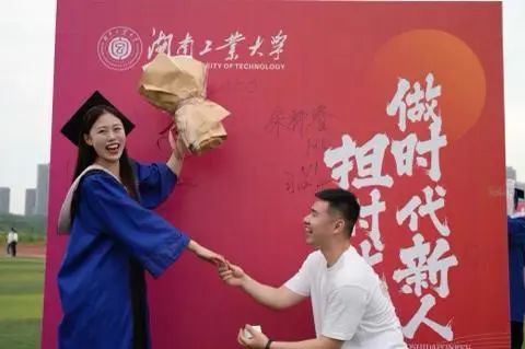 6月15日,湖南工业大学举行2023届毕业典礼暨学位授予仪式。在硕士研究生学位授予仪式上,该校广播电视专业毕业生胡同学在收获学位证的同时,也收获了男友现场求婚、为她戴上戒指的甜蜜,他们开心的合影刷屏了很多人的朋友圈。