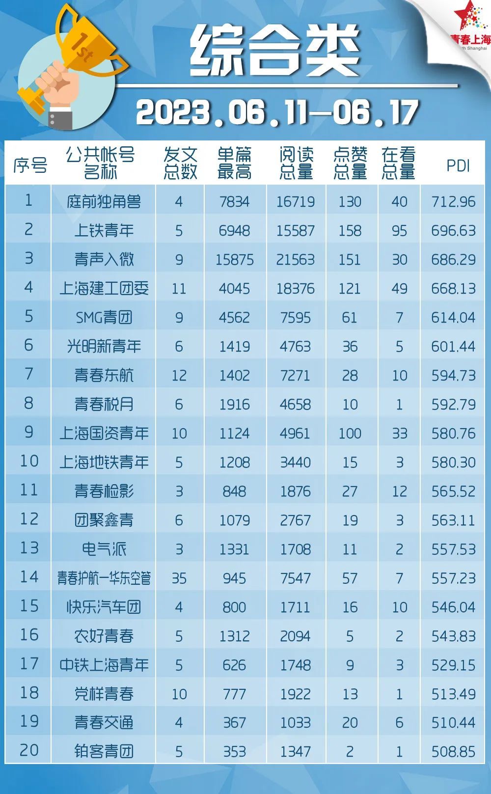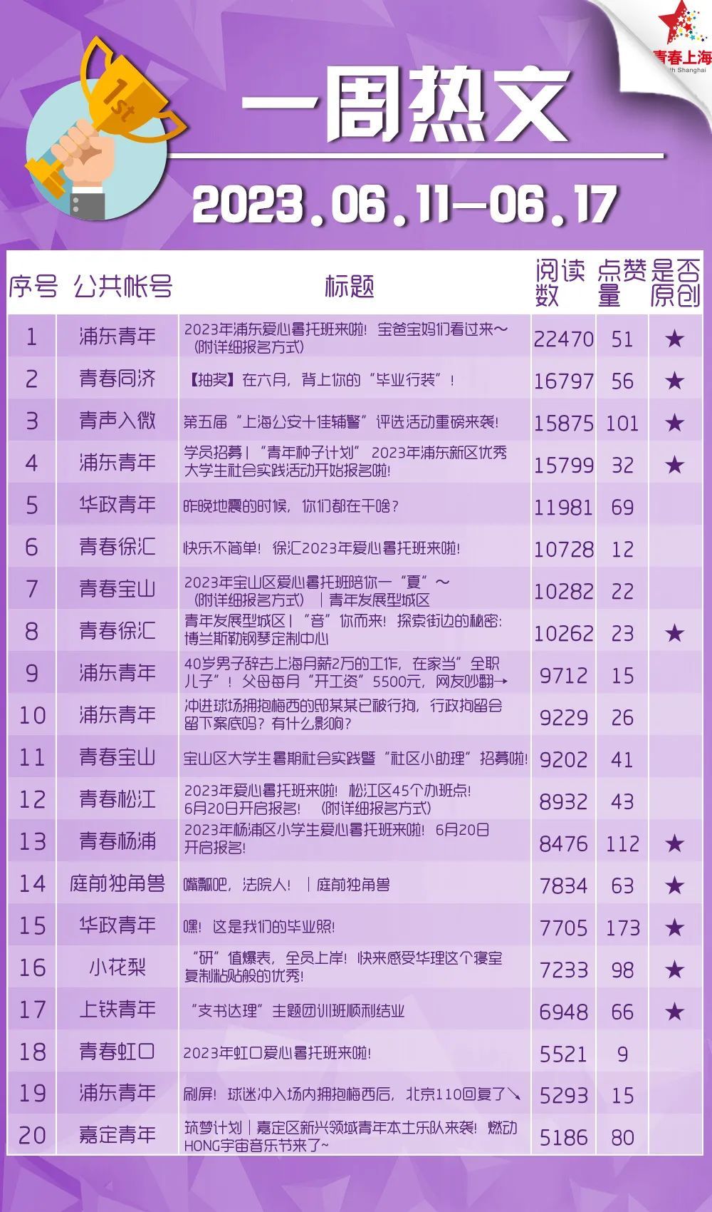 ☆此外,本期还有多篇文章投票类、公示类文章登上热文榜单。青声入微发布《第五届“上海公安十佳辅警”评选活动重磅来袭!》、浦东青年发布《学员招募 | “青年种子计划” 2023年浦东新区优秀大学生社会实践活动开始报名啦!》、青春徐汇发布《青年发展型城区 | “音”你而来!探索街边的秘密:博兰斯勒钢琴定制中心》。