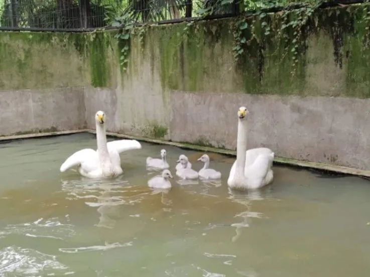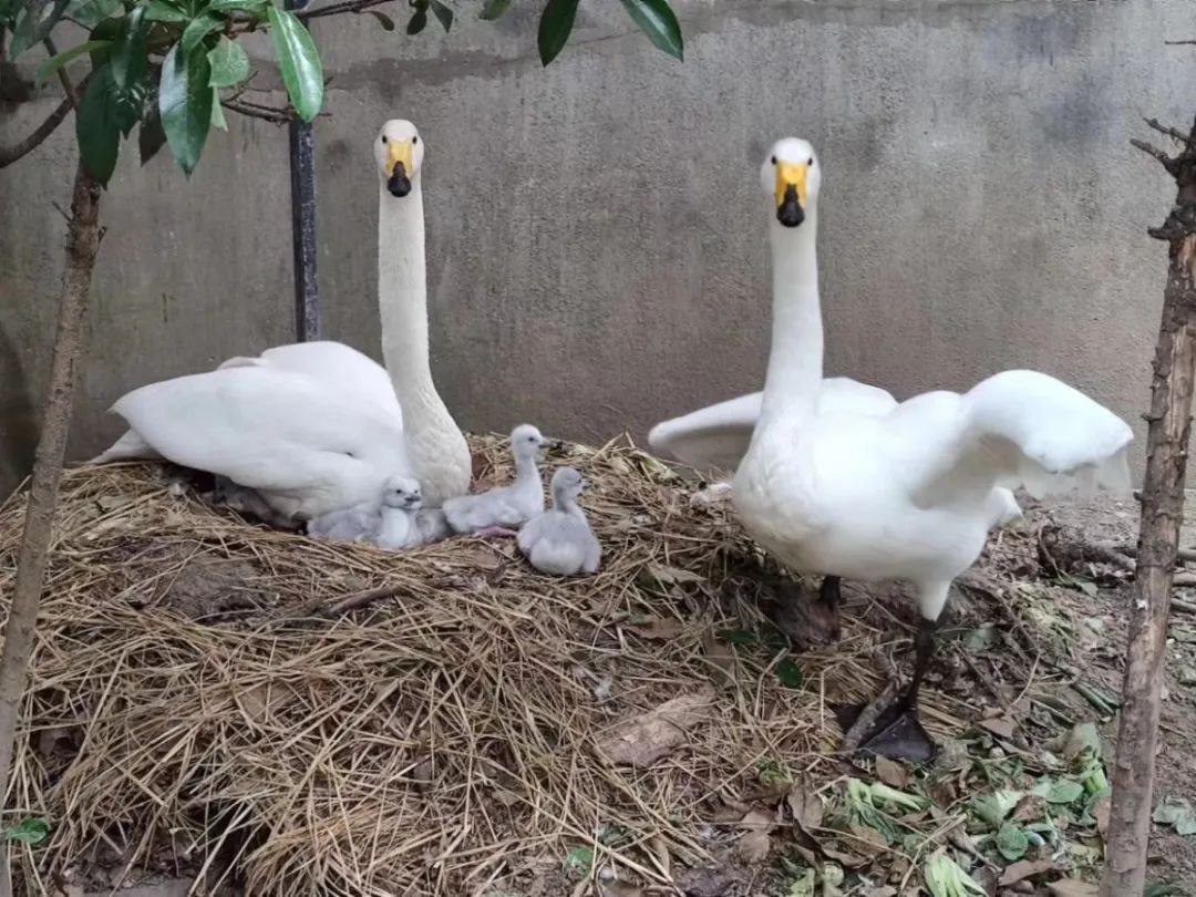 而涉禽后场的大天鹅夫妇,今年更是新添了5个宝宝,这打破了它们的繁殖记录。今年4月7日,后场的雌性大天鹅产下第1枚蛋,随后的8天,又产下4枚蛋。经过30天的孵化,大天鹅宝宝在两天内全部出雏。