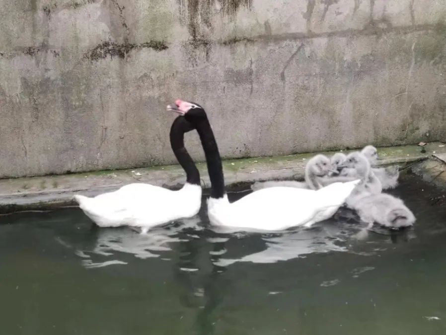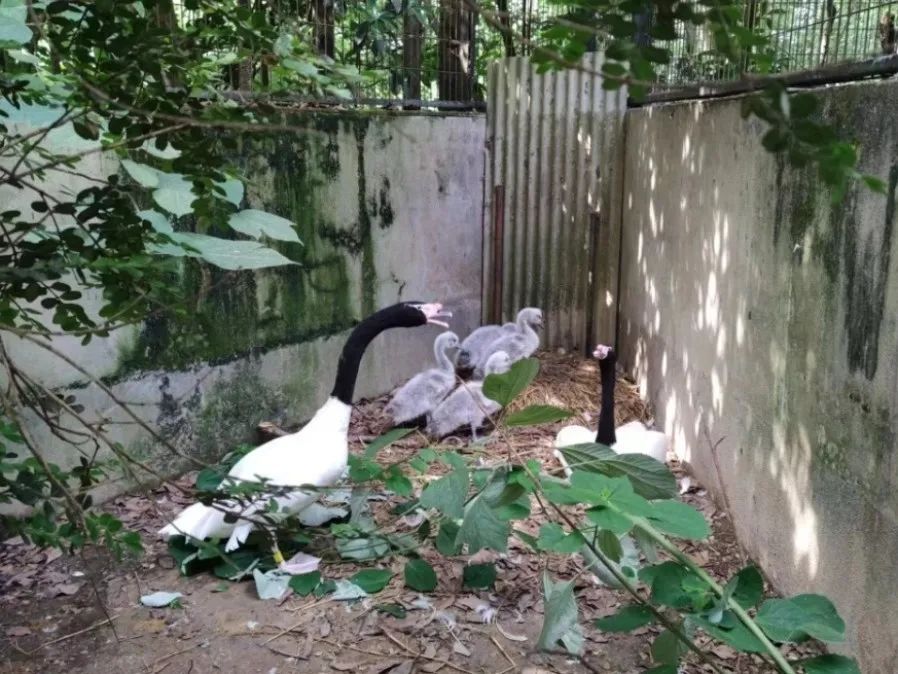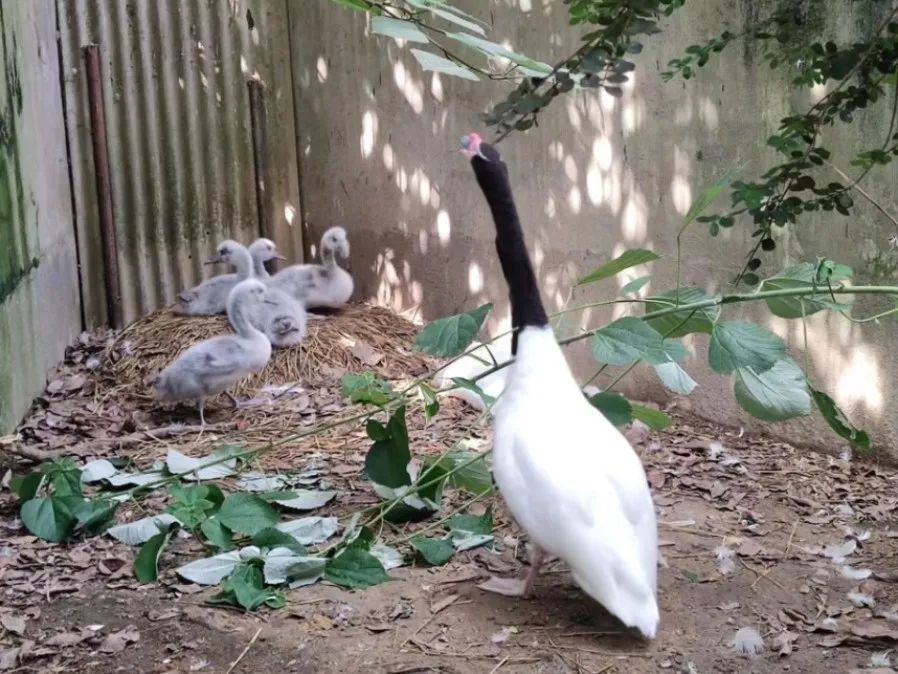 住在涉禽后场的一对黑颈天鹅,今年又孵化出了4个宝宝。从3月中旬产卵开始,饲养员就密切关注它们的动静。到4月22日,终于见到黑颈天鹅幼鸟出雏了,5枚蛋中除了一个是未受精的,其它4枚全部顺利孵化。这下可忙坏了黑颈天鹅的父母。