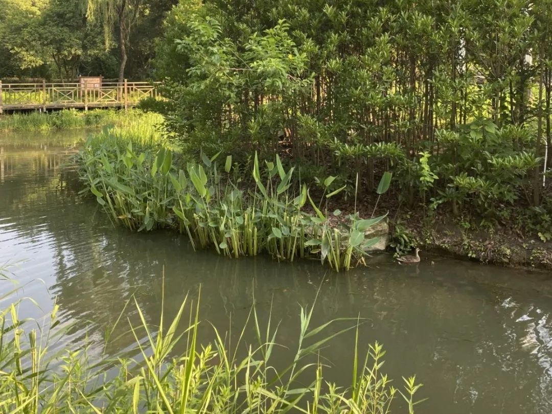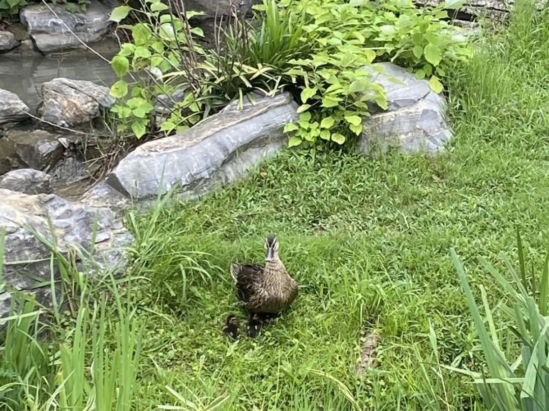 现在,时常能看到鸭妈妈带着4只毛茸茸的鸭宝宝在水里穿梭。鸭妈妈身上的羽毛呈灰褐色,4只鸭宝宝身上的绒毛黄黑相间,十分可爱。准备登陆,鸭妈妈俯下身一跃就上岸了,可鸭宝宝们却犯了难,鸭妈妈见孩子们迟迟上不了岸,又下水带着孩子们继续向前游去。到了平缓的瀑布口,一家5口成功登陆。