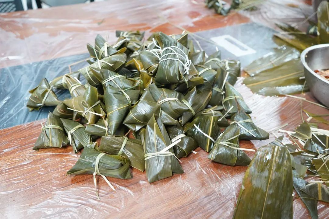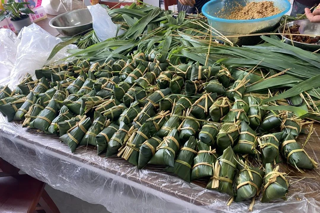 一大早,活动现场就已粽叶飘香,志愿者和村民们热热闹闹地忙碌了起来。将提前泡好的粽叶、糯米、洗净的猪肉和绳线等食材整齐地摆放在桌上。