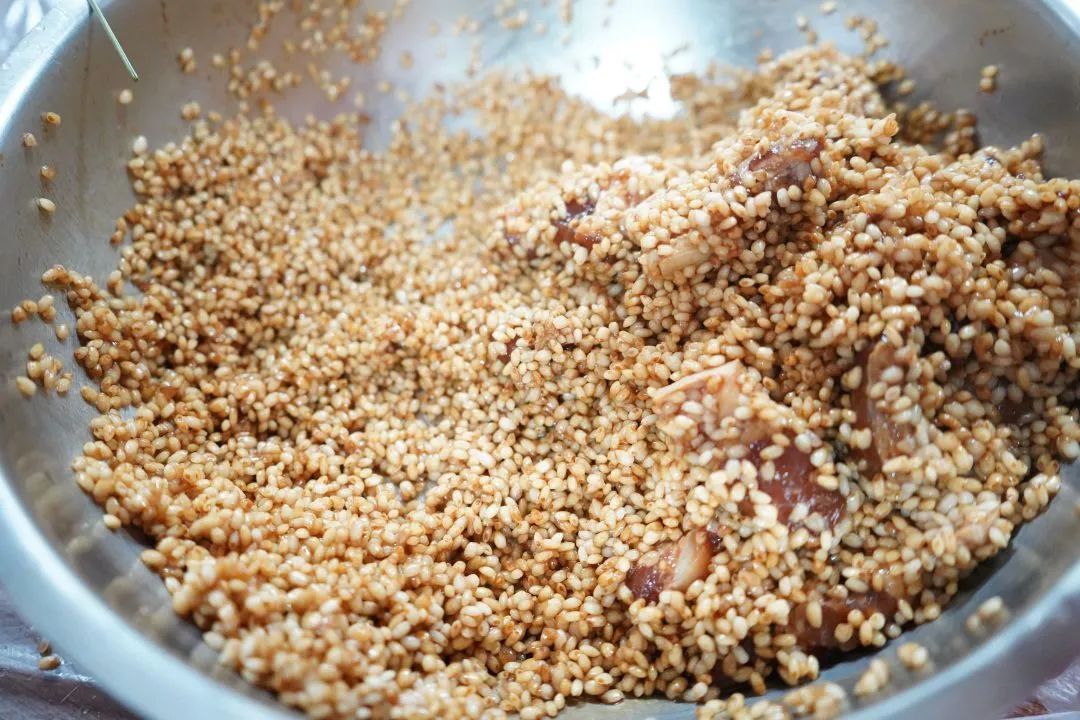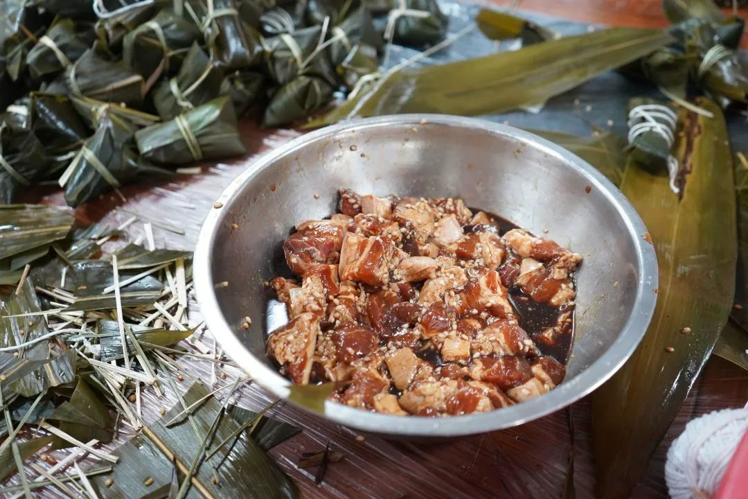 村民们围在一起,把提前浸泡好的糯米和洗净切好的猪肉加入适量的酱油调味。浸放一会后,等酱油完全渗入到糯米和猪肉中,就可以开始裹粽子啦!