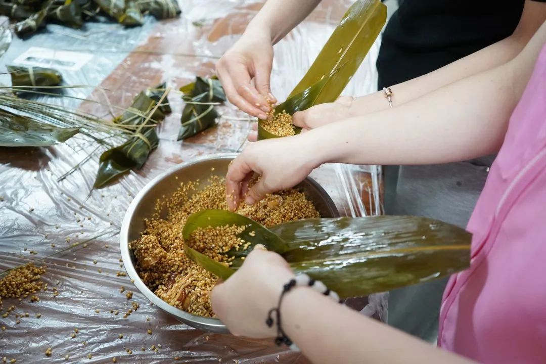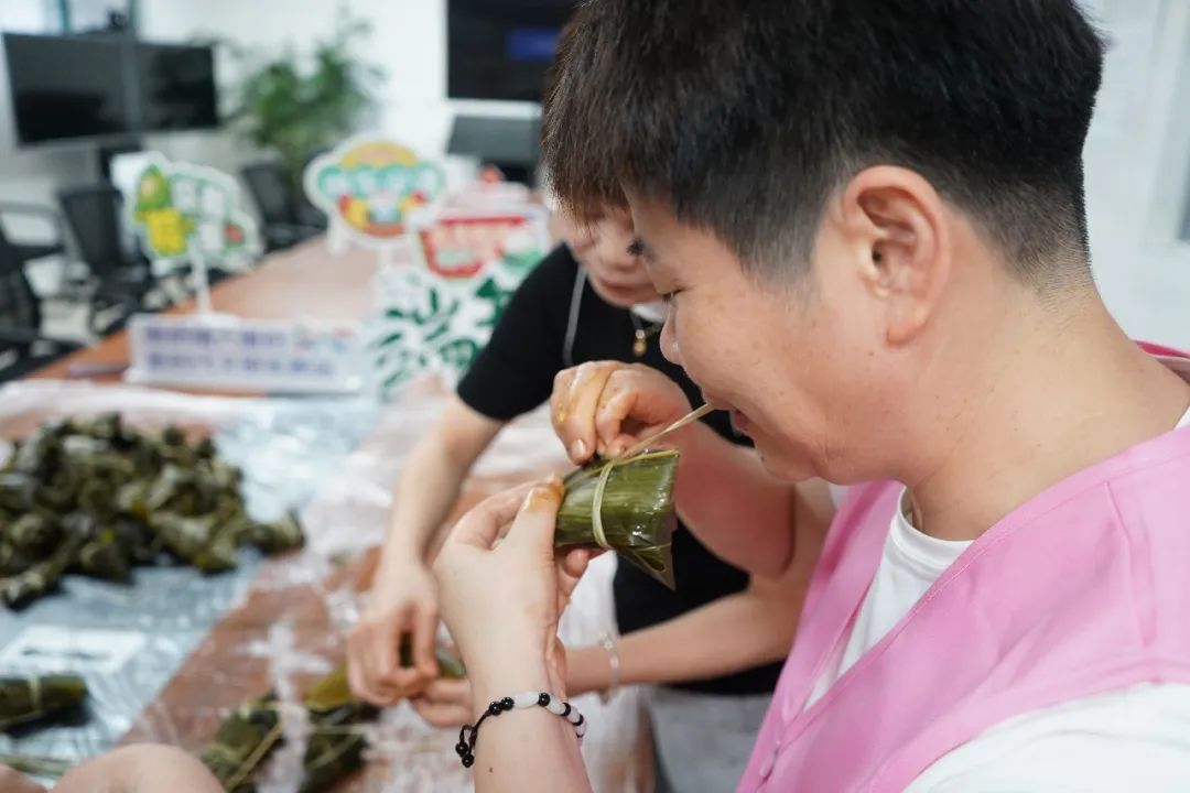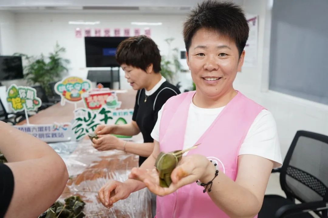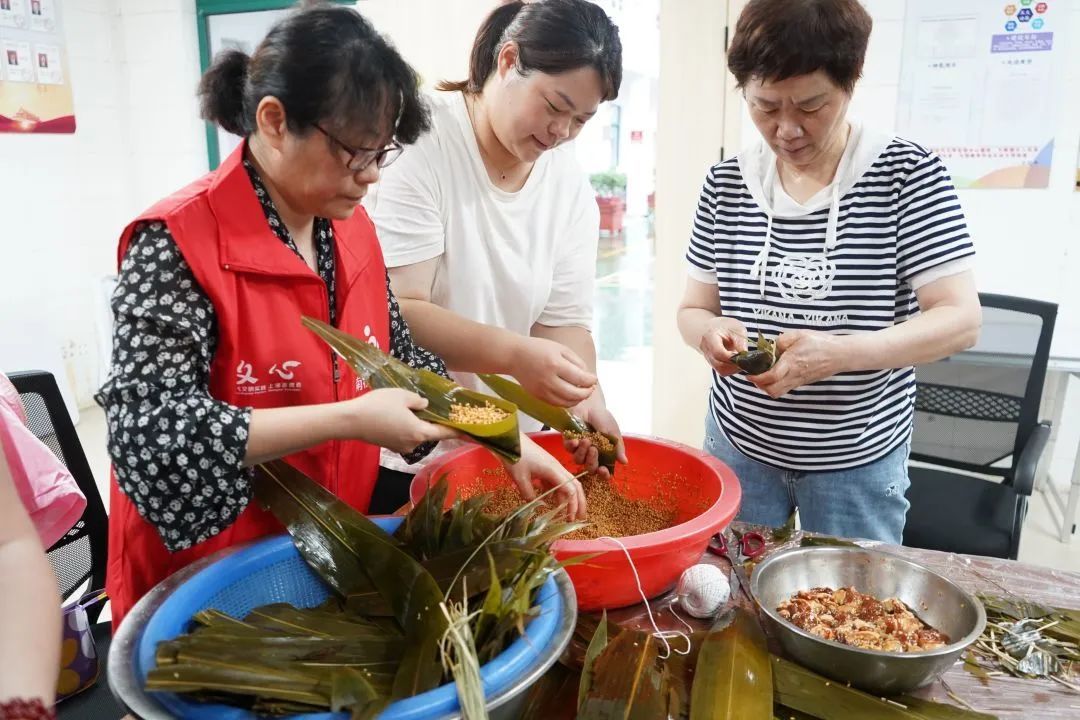 不一会儿功夫,三角粽、枕头粽等一只只胖嘟嘟的漂亮粽子在阿姨们的手中瞬间成型。活动现场洋溢着浓浓的粽叶清香味和轻松喜悦的气氛。