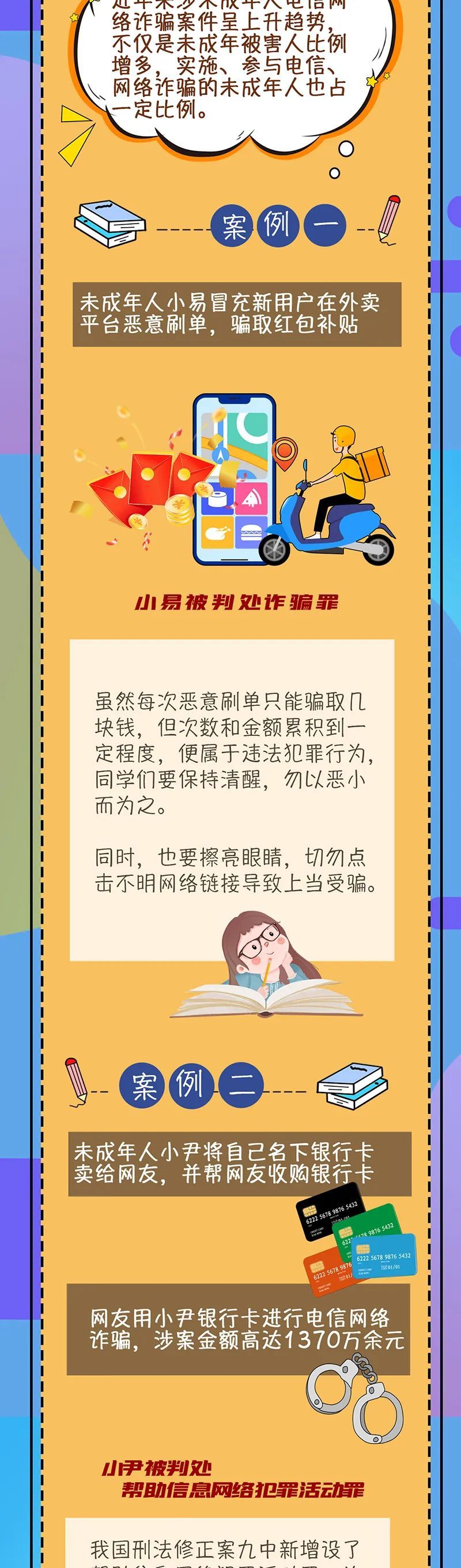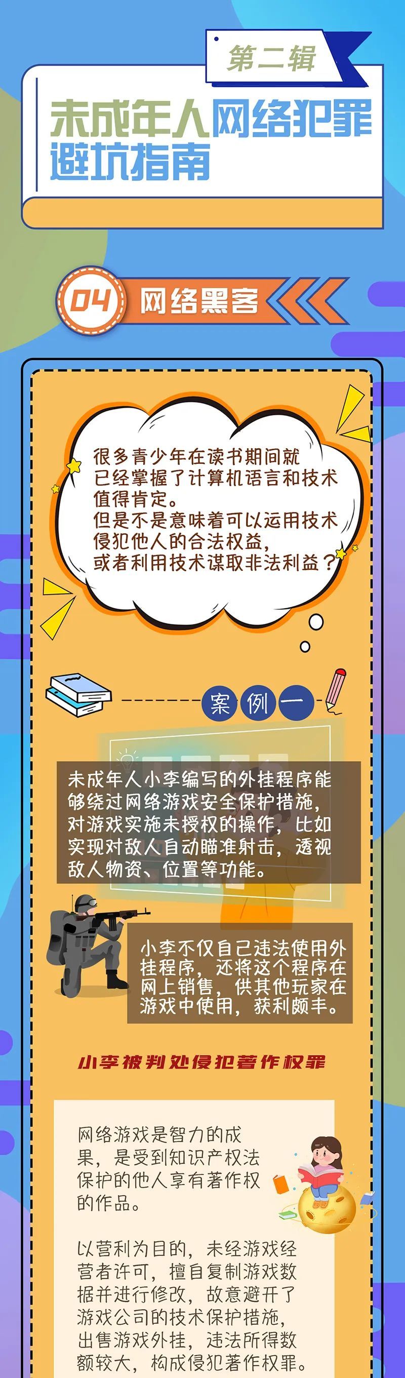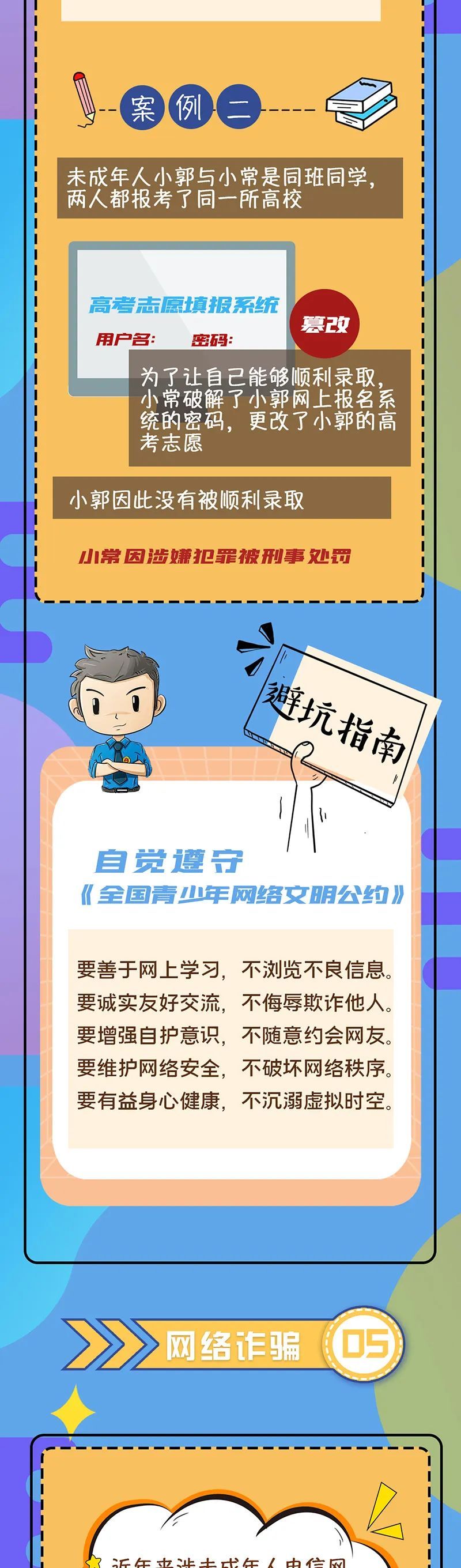 上期,检察官详细讲解了关于未成年人网络盗窃、网络涉毒、网络谣言三类典型网络犯罪。今天,检察官将继续为大家讲述未成年人在网络诈骗、网络黑客方面的法律问题,帮助同学们增强法律意识,学会避开网络空间中的违法犯罪陷阱。