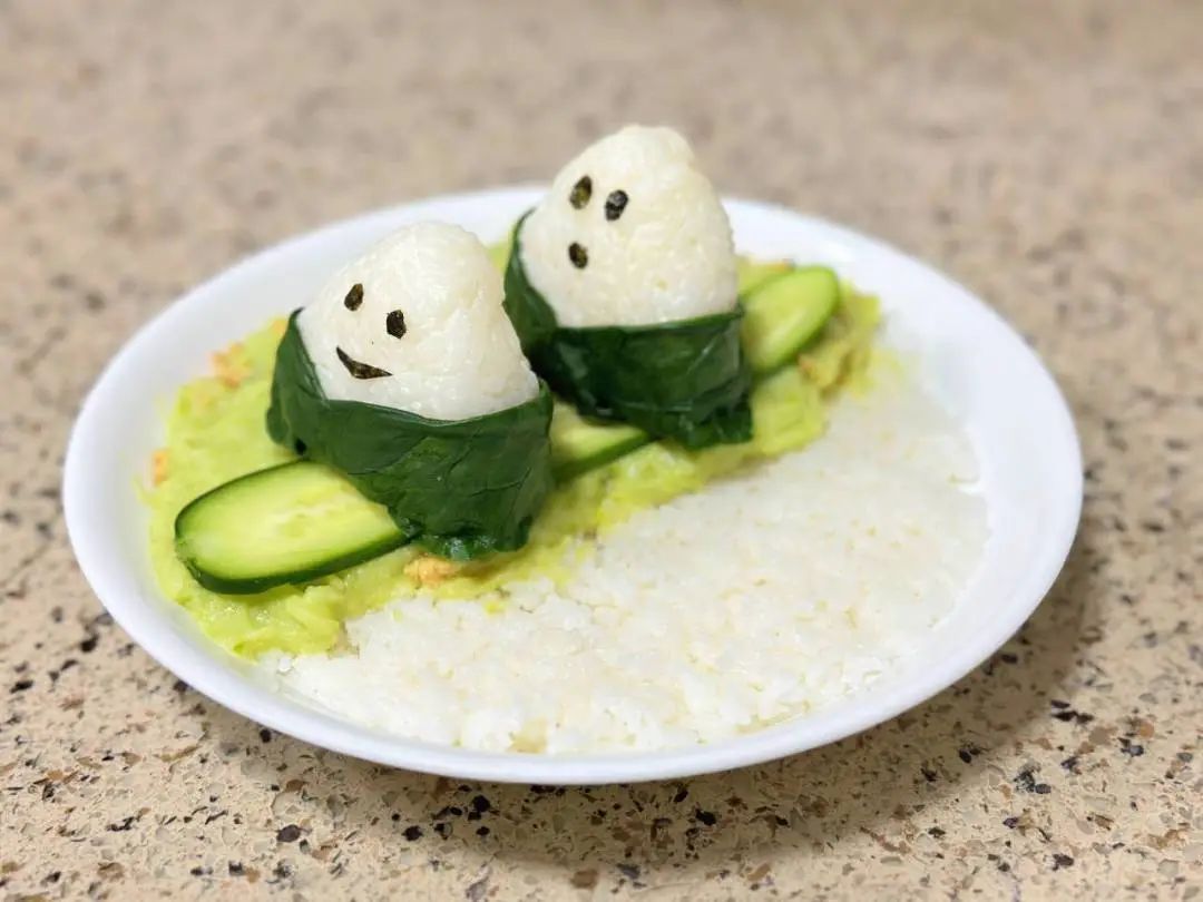 4.取空盘,将冷却的米饭盛出铺在盘底,加入炒好的肉末,在肉末上铺上青豆山药泥,摆上切好的黄瓜片和包好的饭团,最后把海苔片剪成自己喜欢的形状,装饰饭团。