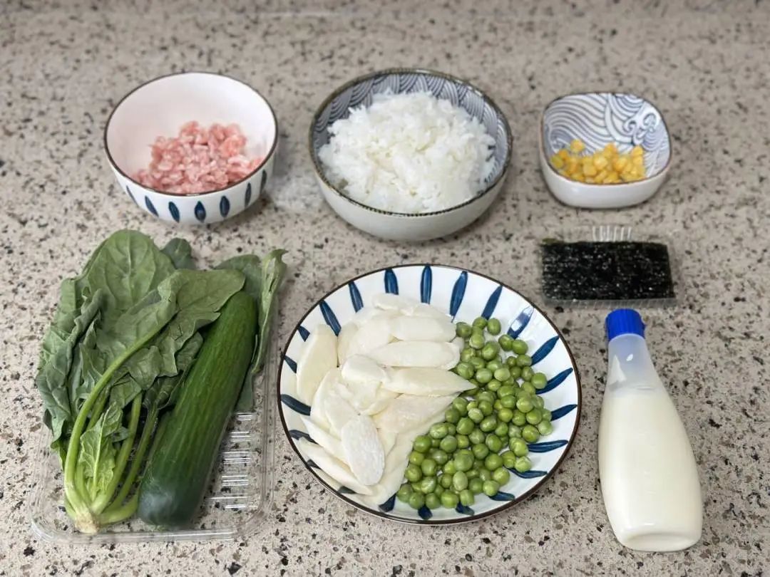 食材:米饭、菠菜、猪肉糜、玉米粒、青豆、山药、黄瓜、海苔片、色拉酱。