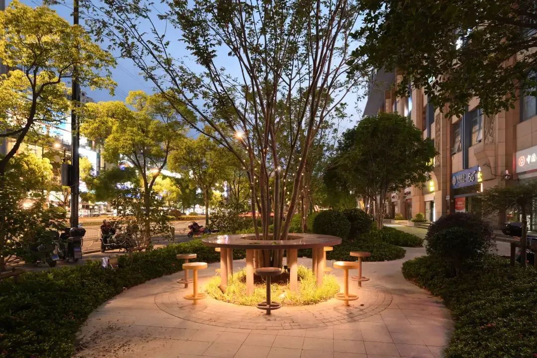 涟漪吧台,景如其名。只见环形的休憩座椅围树而建,设计师在保留原有的苍翠绿植的基础上,巧妙地打造出让居民走得进来、坐得下去的休闲空间。夜幕降临,树上璀璨的灯光闪闪发亮,煞是好看。