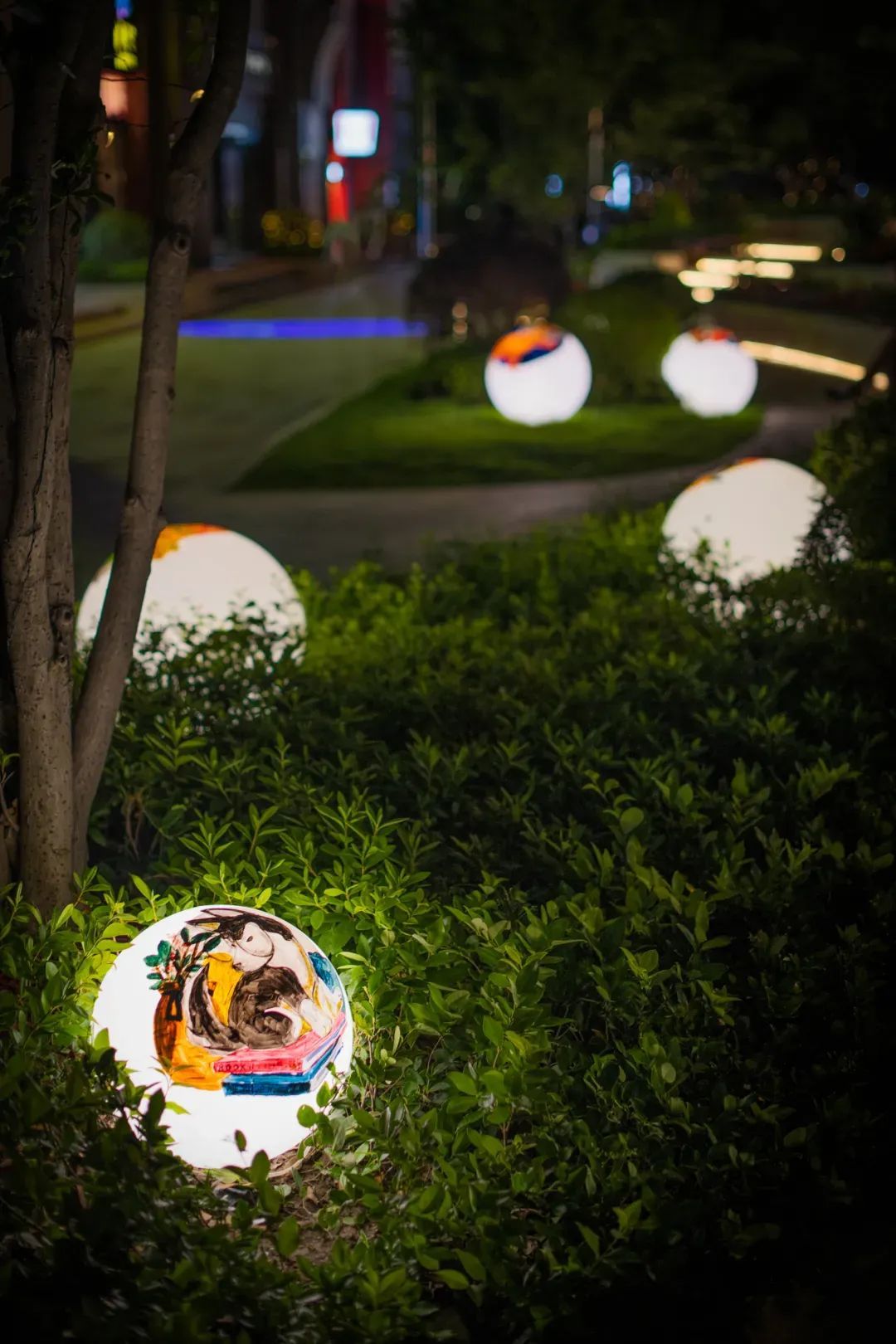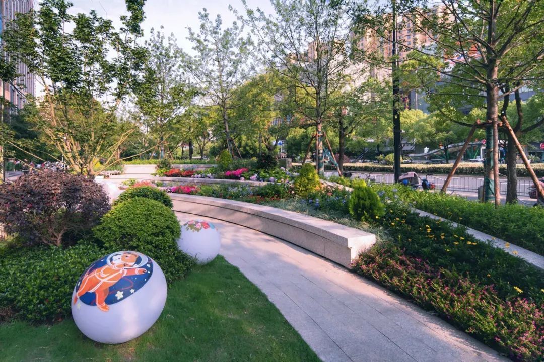 潮汐剧场以高低错落的石阶为凳,周边种植了当季的时令花卉,让空间富有跳跃感。石阶前的草坪上点缀着大小各异、色彩斑斓的球体灯柱。夜晚时分,灯柱被点亮,仿佛闪耀的明星镶嵌在广袤的银河。值得一提的是,球面上的萌宠画作皆出自长宁美校学生之手,这也是周家桥街道探索多元主体参与街区治理的新尝试。