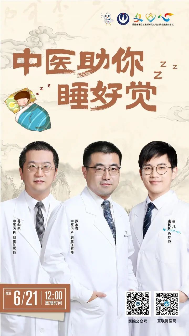 6月21日(周三)12:00,普陀区中心医院5G健康直播间将以《中医助你睡好觉》为主题,由中医内科副主任医师罗家祺、副主任医师葛华迅、康复科治疗师胡凡一起搭档,带你了解中医方法如何帮助你“睡个好觉”。观众朋友们,让我们不见不散~