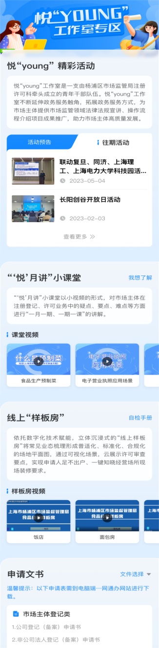 悦“young”工作室专区包含悦“young”精彩活动、“‘悦’月讲”小课堂、线上“样板房”和申请文书四个版块,专区已汇聚小课堂视频3个、“样板房”视频3个和各类申请文书36个,为企业提供市场监管领域法律法规宣讲、操作流程介绍、项目成果推广,通过创新服务模式,助力企业高质量发展。