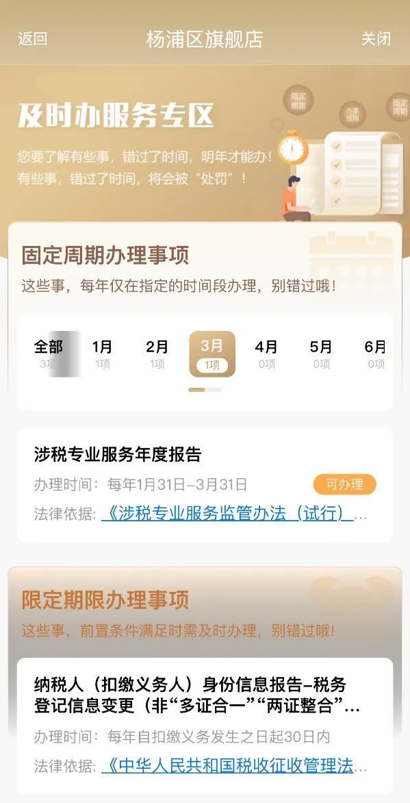 “及时办”专区是为用户提供办事日历、收藏订阅、关联解读、智能小申等应用的快捷服务型专区。“及时办”能结合杨浦区企业用户的数据,提供主动提醒、关联推荐等主动化服务,保证企业用户能够及时办理所需业务,不错过具有时间期限的业务。