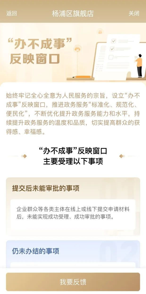 “办不成事”反映窗口是用户在业务无法顺利办理时能直接向上级沟通的联系渠道,对于提交后未能成功受理和成功审批的事项、用户多次跑动仍未办结的事项、办理时间过长的事项以及不清楚如何办理的事项等问题,企业群众均可通过该窗口实现有效反馈。