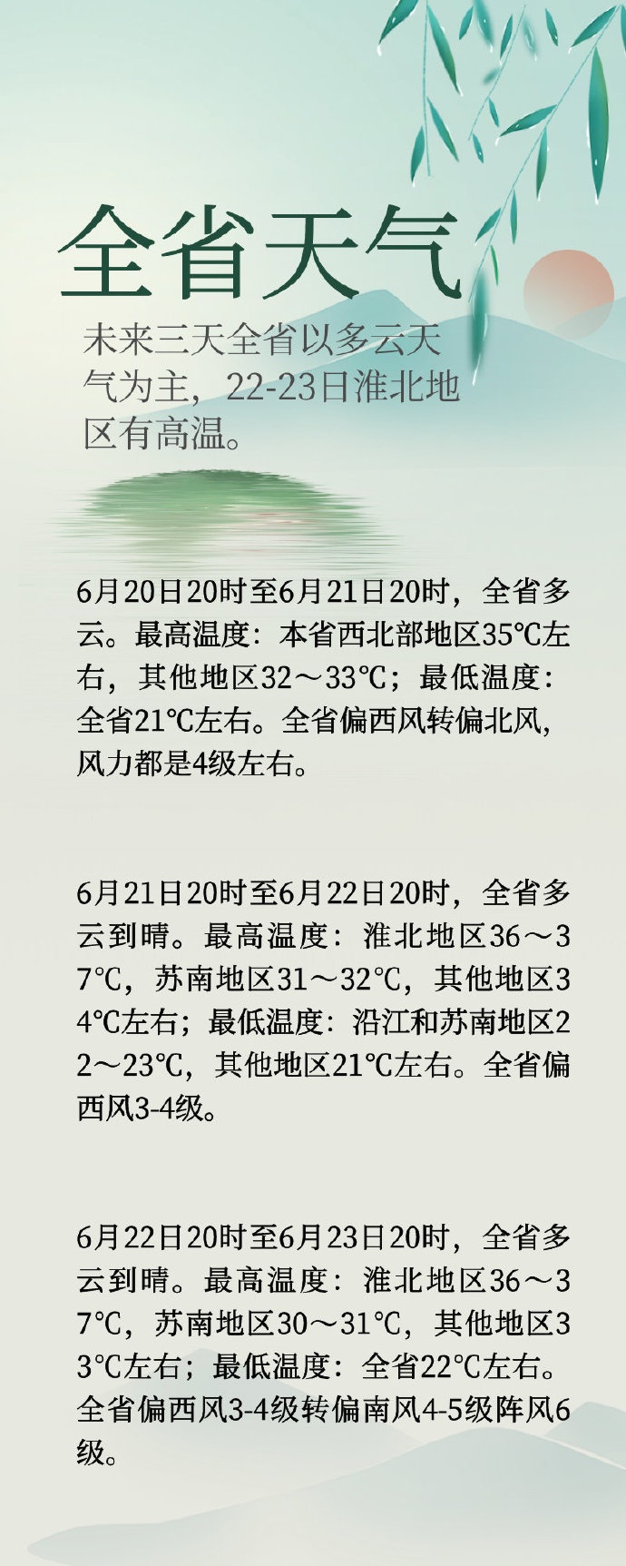 未来三天全省以多云天气为主,22-23日淮北地区有高温。6月20日20时至6月21日20时,全省多云。最高温度:本省西北部地区35℃左右,其他地区32~33℃;最低温度:全省21℃左右。全省偏西风转偏北风,风力都是4级左右。