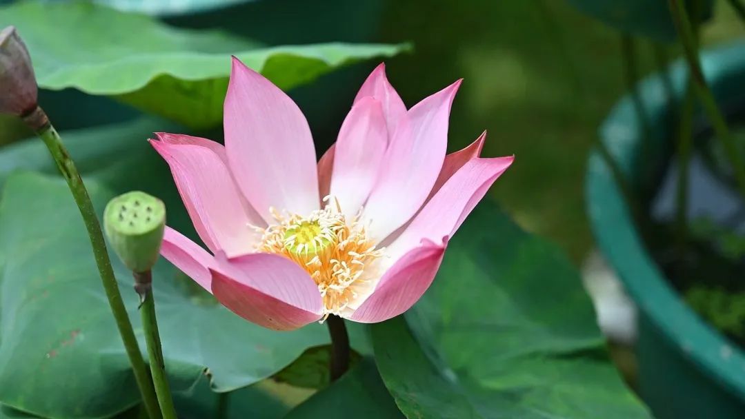 大草坪附近,历届全国荷花展的获奖品种代表以缸栽形式展出,一次性让游客们大饱眼福。“我们收集了很多最新、最优的的品种,比如现在盛开的这个‘杏脸桃腮’品种,它的花瓣瓣尖非常狭长,整个形态给人飞舞飘逸的感觉,十分漂亮。”上海古猗园园容科工程师王冠飞介绍。