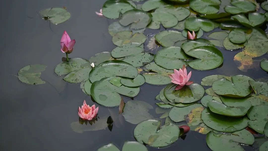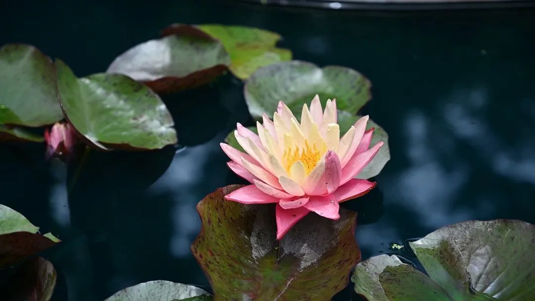 祥云造型的睡莲池中,色彩斑斓、明朗秀丽的睡莲静静地躺在水面上,渐渐睁开朦胧的睡眼,晶莹滋润,楚楚动人。