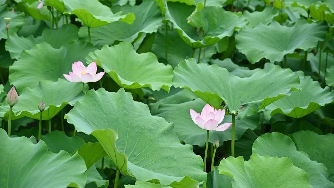 荡漾的湖波上,青碧荷叶连绵无尽,一朵朵粉白荷花开在碧叶之间。微风拂过,仿佛一团碧玉的云彩飘过,送来屡屡花香。