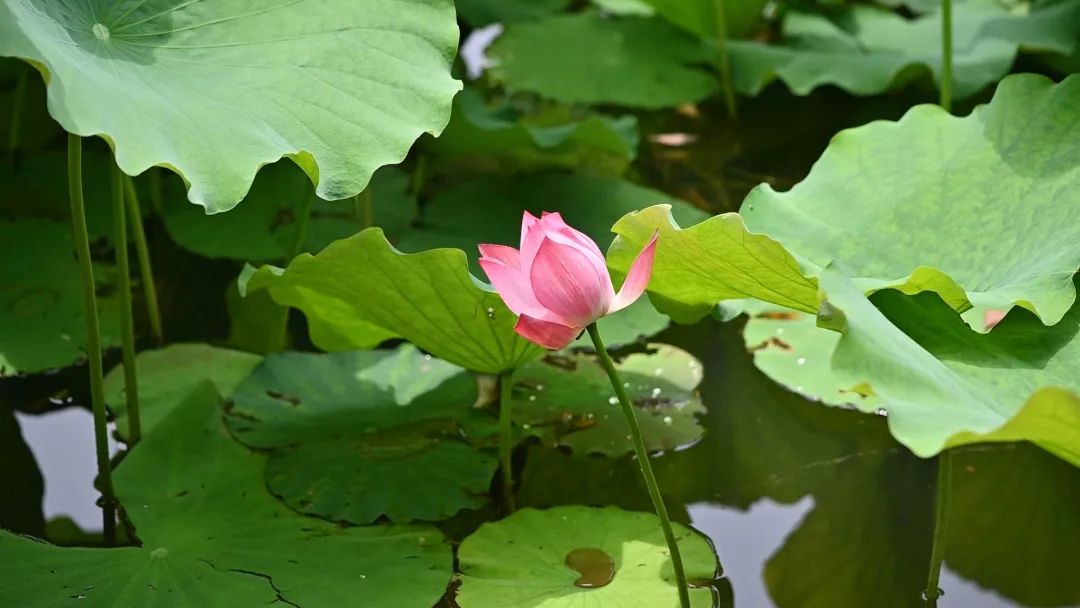沿着蜿蜒曲折的木栈道走向湖心,古朴的竹亭映衬着千姿百态的荷莲,勾勒出一幅充满诗意的画卷。