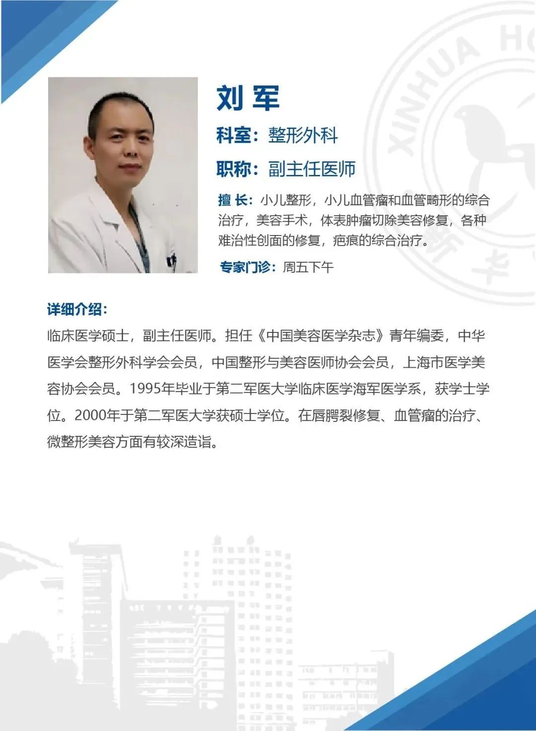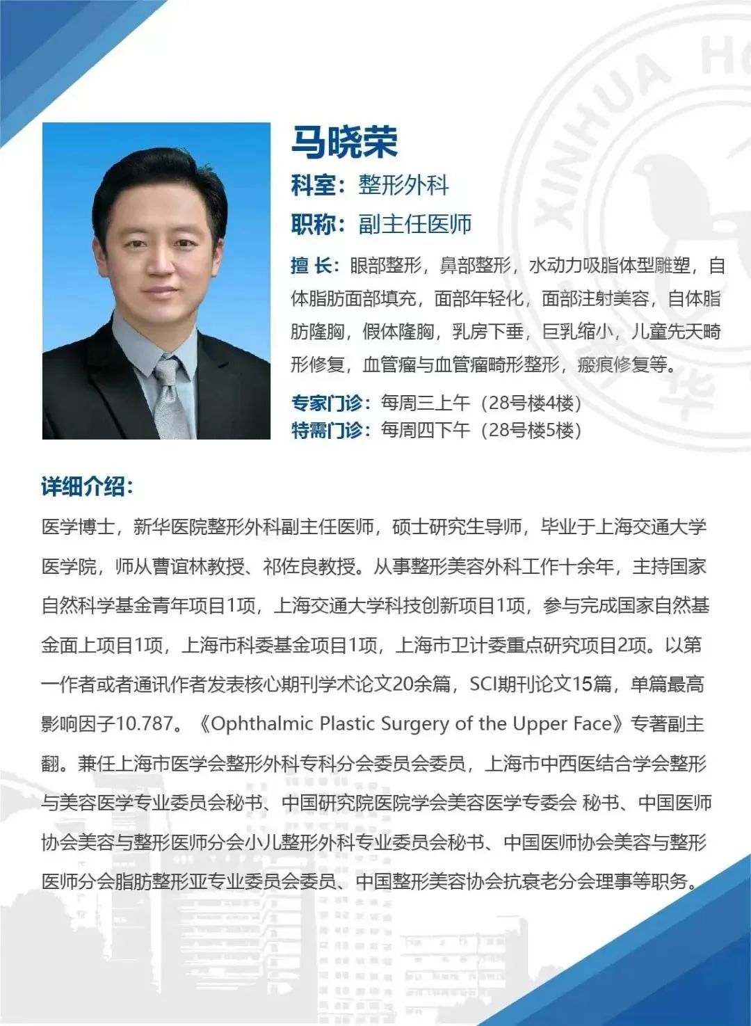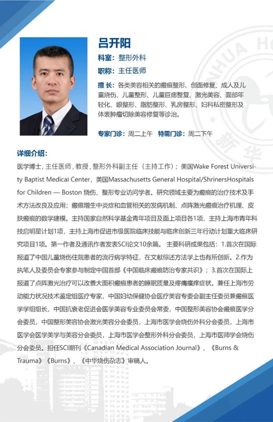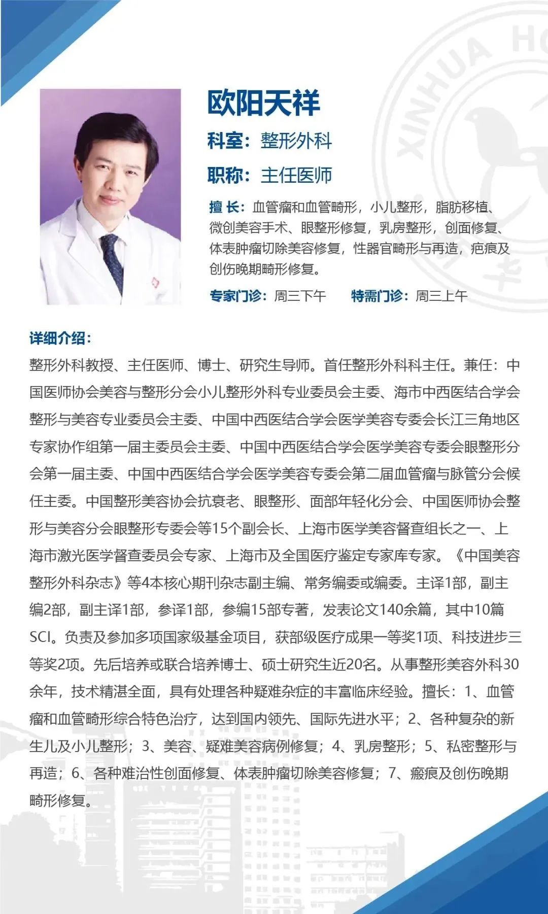 上海交通大学医学院附属新华医院整形外科建立于2005年,首任科主任欧阳天祥教授,现任学科带头人吕开阳副教授。目前,科室拥有一支具有高学历、高职称专科化的人才队伍。学科临床特色包括:血管瘤;瘢痕整形;小儿或成人烧伤整形;唇腭裂修复;耳畸形修复;鼻畸形修复;颌面部整形;眼整形;鼻整形;乳房整形;手足粘连等其他体表畸形整形修复;体表肿物、巨痣、胎记切除,同时在医美整形方面包括面部年轻化;注射微整;面部整形失败修复;私密整形;吸脂及脂肪移植方面均达到国内先进水平。近5年科室在JAMA、Burn Trauma、Lasers Surg Med等专业学术期刊发表SCI论文及学术观点10余篇,获得省部级以上科研基金项目3项。
