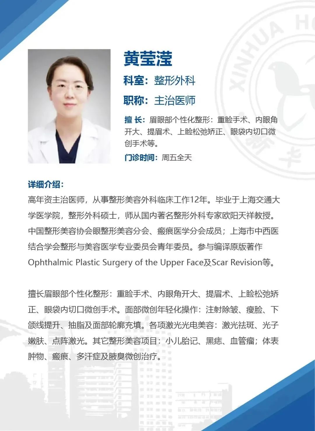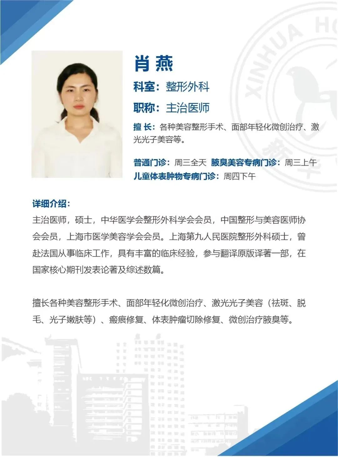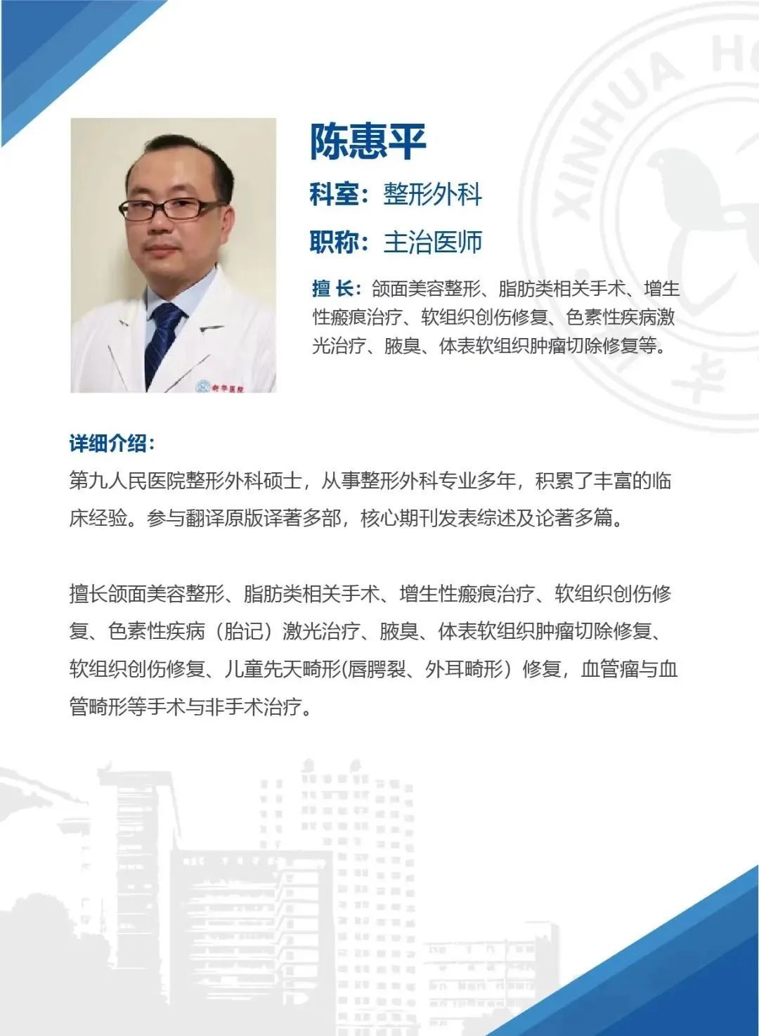 上海交通大学医学院附属新华医院整形外科建立于2005年,首任科主任欧阳天祥教授,现任学科带头人吕开阳副教授。目前,科室拥有一支具有高学历、高职称专科化的人才队伍。学科临床特色包括:血管瘤;瘢痕整形;小儿或成人烧伤整形;唇腭裂修复;耳畸形修复;鼻畸形修复;颌面部整形;眼整形;鼻整形;乳房整形;手足粘连等其他体表畸形整形修复;体表肿物、巨痣、胎记切除,同时在医美整形方面包括面部年轻化;注射微整;面部整形失败修复;私密整形;吸脂及脂肪移植方面均达到国内先进水平。近5年科室在JAMA、Burn Trauma、Lasers Surg Med等专业学术期刊发表SCI论文及学术观点10余篇,获得省部级以上科研基金项目3项。